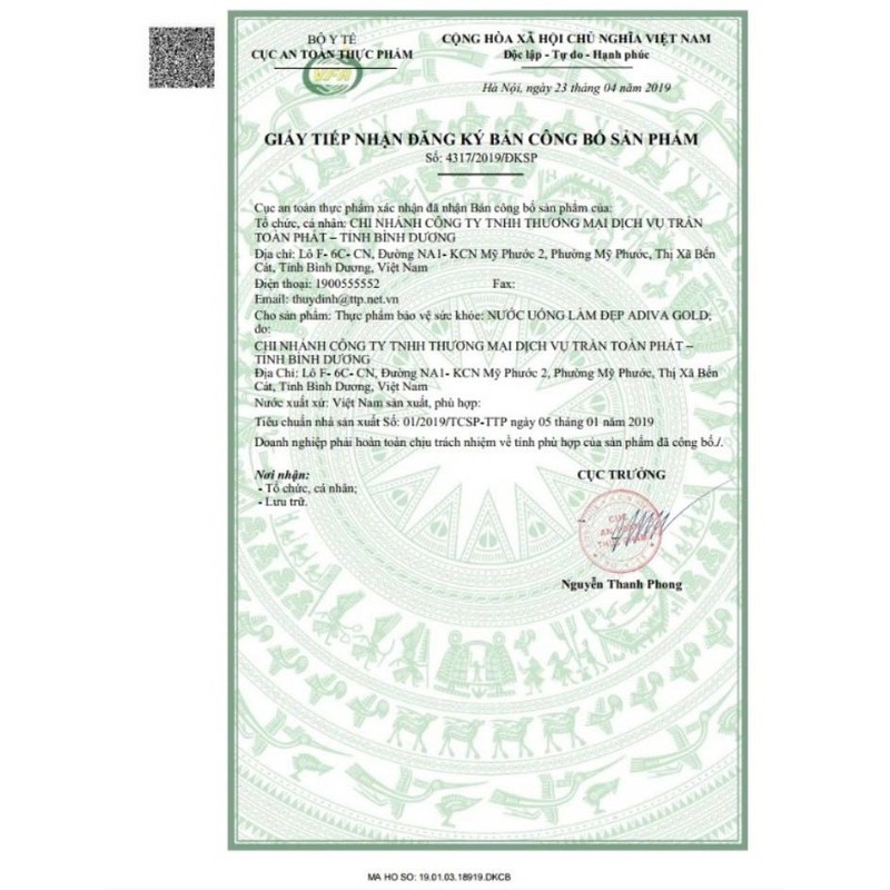 Quy cách ADIVA Collagen Gold dạng nước:Hộp 14 chai x 30 ml giá: 560.000