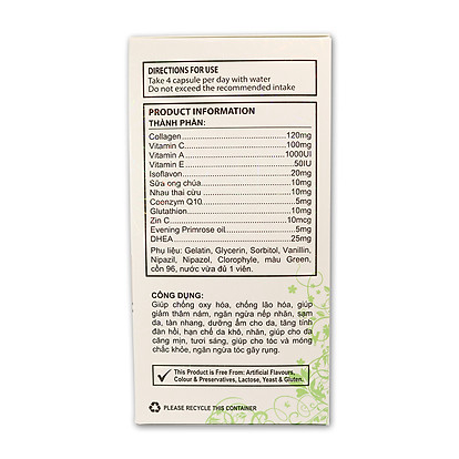 Collagen 120mg, Vitamin C 100mg, Vitamin A 1000UI, Vitamin E 50IU, Isoflavon 20mg, Sữa ong chúa 10mg, Nhau thai cừu 10mg, Coenzym Q10 5mg, Glutathion 10mg, Zin C 10mcg, Evening Primrose oil 5mg , DHEA 25mg