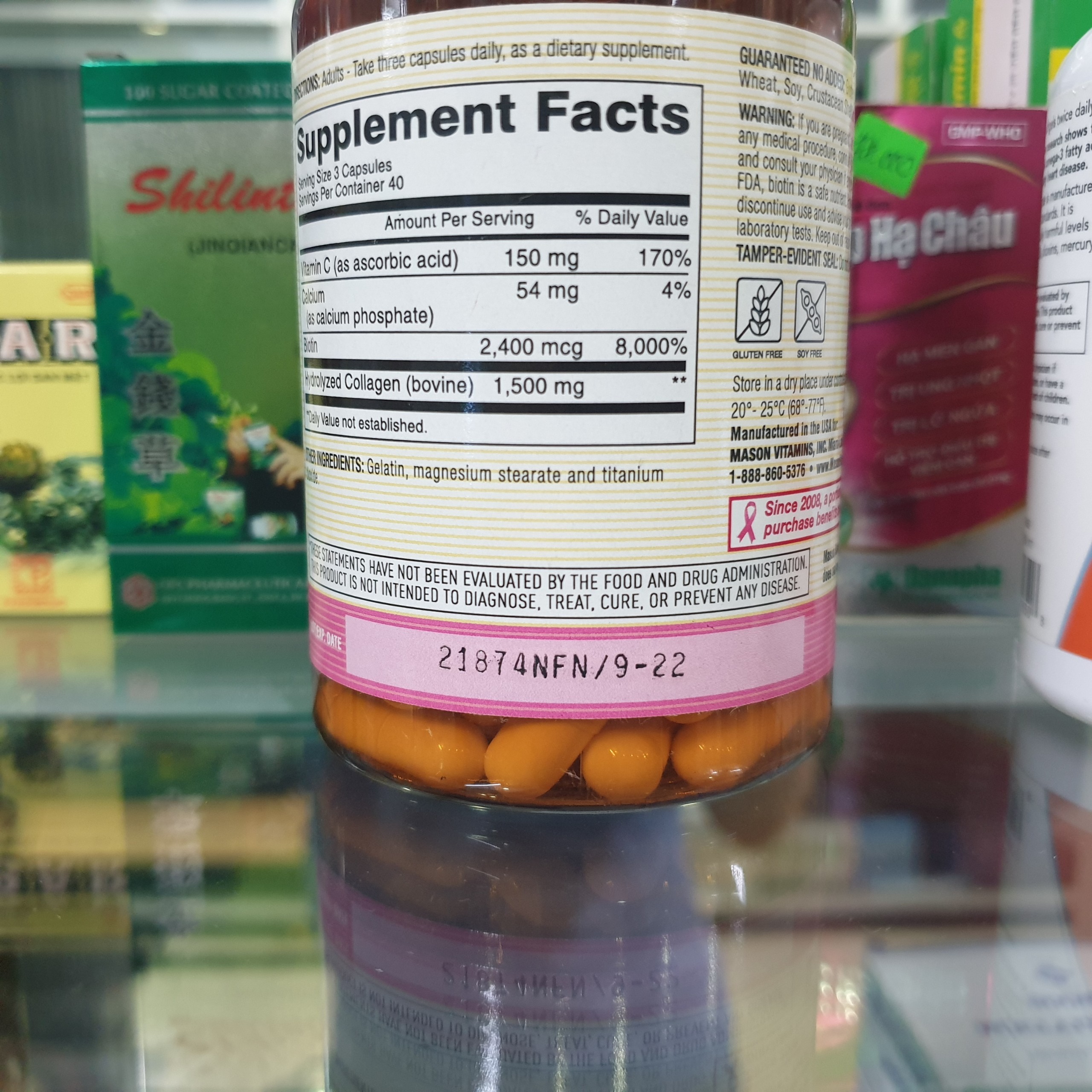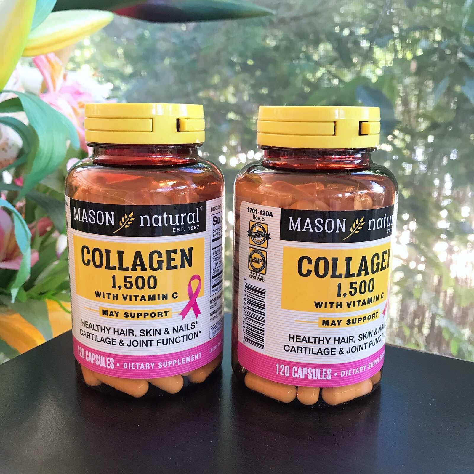 - Tuy nhiên không dừng lại ở đó, mason tiếp tục nghiên cứu và cho ra đời một dòng sản phẩm mới phù hợp hơn với người cần bổ sung lượng collagen lớn trong thời gian ngắn – collagen 1500 vitamin C plus với hàm lượng collagen cao hơn được bào chế ở dạng thủy phân tăng khả năng hấp thu, đồng thời bổ sung vitamin C và biotin giúp củng cố làn da sâu hơn nữa. Đặc biệt với liều 3 viên cho 1500 mg collagen thay vì 2 hay một viên, chị em có thể dễ dàng lựa chọn và thay đổi liều dùng thích hợp với mình nhất qua mỗi giai đoạn.
