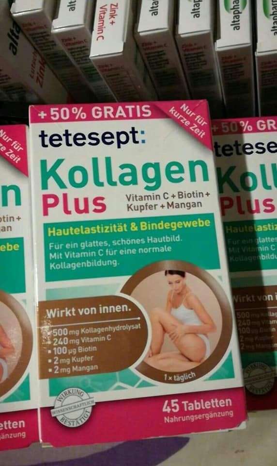 VIÊN BỔ SUNG COLLAGEN PLUS TETESEPTViên này tổng hợp thêm 1 số vitamin và 1 số👉Hàng nội địa Đức🌺Hàm lượng:- 500mg Collagen- 240mg Vitamin C- 100 ug Biotin- 2mg Kupfer- 2mg Mangan ( cái này tác đụng vào enzym ạ )🌺Sự kết hợp hoàn hảo của collagen, vitamin C, biotin, Kupfer và Mangan là những chất cần thiết cho da và giúp cơ thể hấp thụ collagen một cách tốt nhất.🌺Công dụng:👉Chống lại các dấu hiệu lão hóa về da do tuổi tác gây nên như: thâm nám, sạm da, khô da, nếp nhăn, da chảy sệ,tóc yếu ,gãy rụng ,thô chẻ ngọn......👉Giúp xương, sụn, khớp chắc khỏe để bạn được thoải mái hơn trong các hoạt động mỗi ngày.👉Giảm thiểu những nỗi lo về loãng xương, xốp xương, thoát vị đĩa đệm.