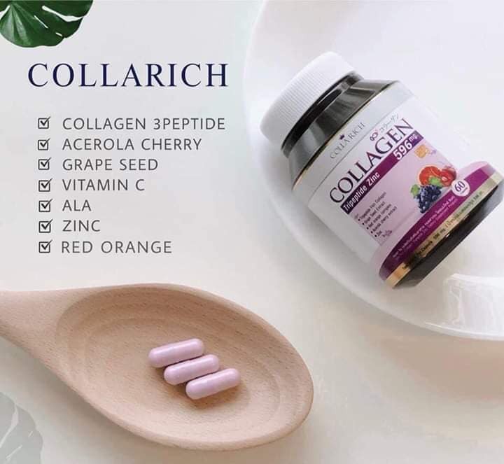 ##VIÊN UỐNG COLLAGEN TRẺ HÓA DA COLLA RICH COLLAGEN Tripeptide Zinc 596mg THÁI LAN•Xuất xứ: Thái Lan•Hộp: 60 viênCOLLA RICH COLLAGEN LÀ SẢN PHẨM ĐANG HOT CỦA THÁI LAN ĐƯỢC SẢN XUẤT THEO CÔNG NGHỆ NHẬT BẢN NHÉ CÁC BẠN.**THÀNH PHẦN CHÍNH:🐋Collagen dầu cá tripeptide🍇Chiết xuất hạt nho Nam Mỹ🍊 Hỗn hợp cam đỏ🍒 Chiết xuất từ cherry anh đào🍏 Kẽm## CÔNG DỤNG :👉Giúp trắng da.👉 Se khích chân lông👉 Xóa thâm quầng mắt👉Giảm dần các nếp nhăn trên tráng và dấu chân chim quanh mắt👉 Làm mờ các vết thâm do mụn👉 Giúp kiểm soát nhờn trên da👉 Giúp trẻ hóa da👉 Giúp phục hồi và làm chắc khỏe da. Tóc.móng👉 Giúp bạn vẫn khỏe đẹp dù bạn thức khuya hay làm việc vất vả👏👏🌺ĐẶC BIỆT GIÚP GIẢI QUYẾT CÁC VẤN ĐỀ VỀ MỤN VÀ NÁM AN TOÀN VÀ HIỆU QUẢ## HDSD:🌻Ngày uống 2 viên: 1 viên buổi sáng và 1 viên tối sau bữa ăn.