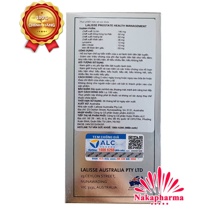 ❤ TIỀN LIỆT TUYẾN ÚC LALISSE PROSTATE HEALTH MANAGEMENT 100V – GIẢM PHÌ ĐẠI, U XƠ LÀNH TÍNH TUYẾN TIỀN LIỆT ⭐⭐⭐NAKAPH 420.000đ