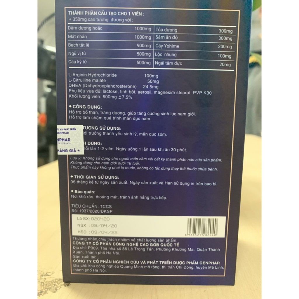 hiệu quả bền vũng lâu dài Những ngời đang cần tình tràn vô sinh, hiếm muộn do tinh trùng yếu Phái mạnh muốn tăng cường sự sung mãn và sức khỏe một cách toàn diện nhất Nam giới muốn làm chậm quá trình mãn dục sau tuổi 35 đến 40 Thành Phần 450mg cao tương đương với: L-Argine 50mg Dâm Dương Hoắc 1000mg L-Citrulline 20mg mật Nhân 1000mg Bạch tật lê 600mg Ngũ Vị Tử 500mg Câu Kỷ Tử 500mg Tỏa Dương 300mg Sâm Ấn Độ 300mg Cây Yohimbe 200mg Lộc Nhung 100mg phụ liệu: bột talc, sodium benzonate vừa đủ viên nang 700mg