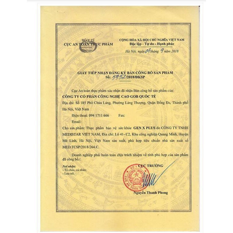 Dạng bào chế: Viên nang mềm Sản phẩm của: CÔNG TY CỔ PHẦN CÔNG NGHỆ CAO GOB QUỐC TẾ Số XNCB: 2527/2018/ĐKSP-XNCB Số XNQC: 01660/2018/ATTP-XNQC Hạn sử dụng: in trên bao bì sản phẩm.