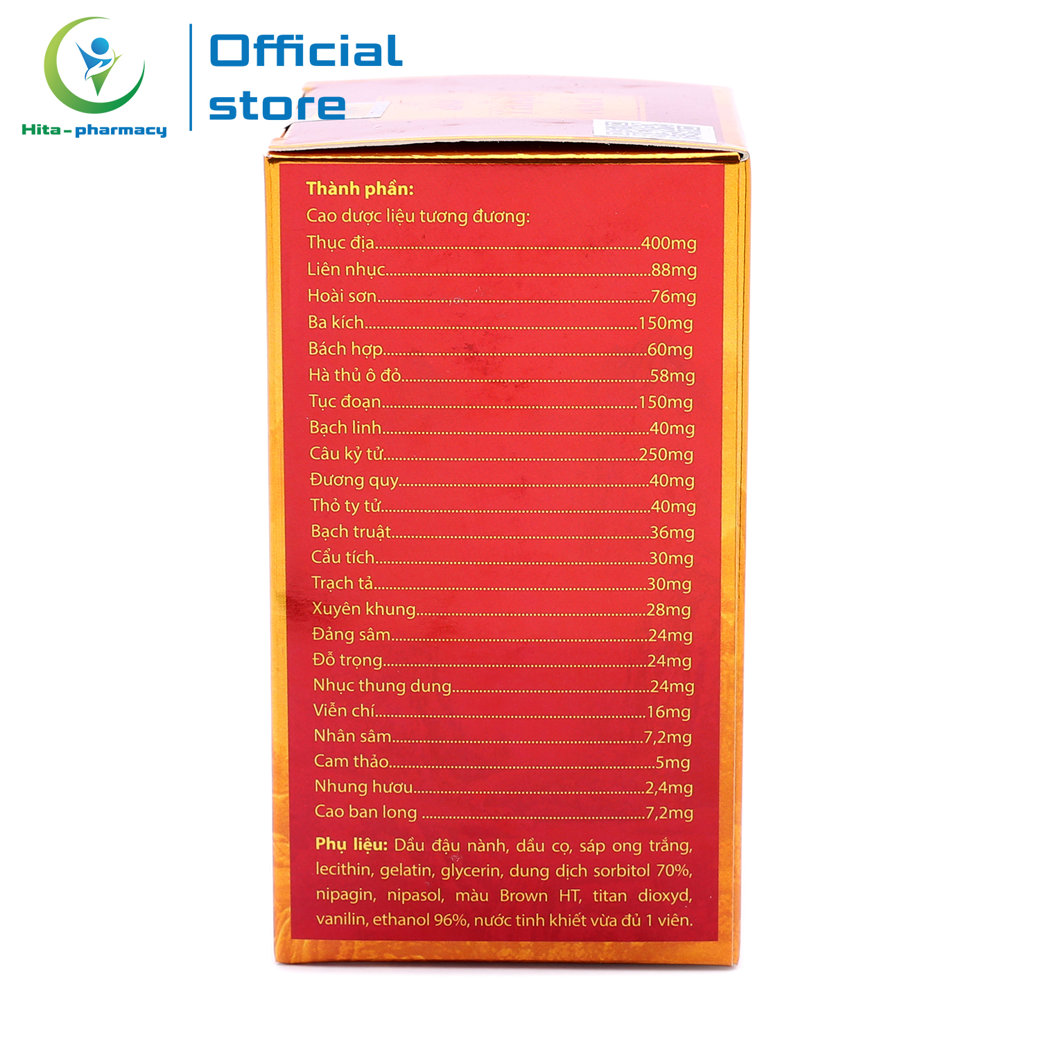 - Phụ liệu : Dầu đậu nành, dầu cọ, sáp ong trắng, lecithin, gelatin, glycerin, dung dịch sorbitol 70 %, nipazin, nipazol, màu Brown HT, titan dioxyd, vanillin, ethanol 96 %, nước tinh khiết vừa đủ 1 viên.