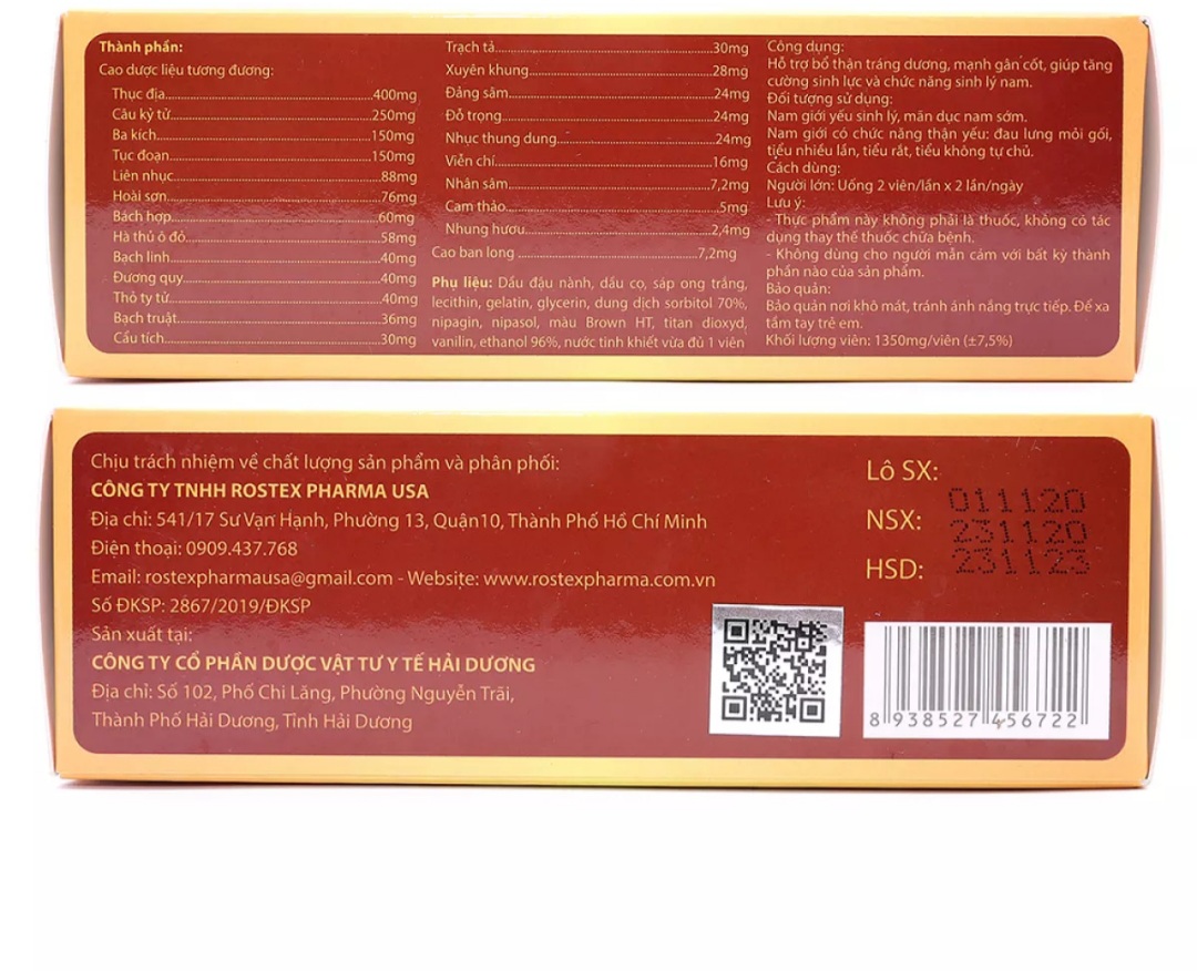 - Bào chế từ 23 loại thảo dược đông y: Tinh chất nhân sâm, lộc nhung, ba kích, cầu kỳ tử, Nhục thung dung ...