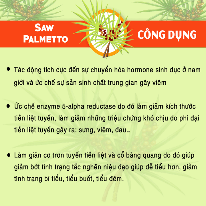 Ngoài ra, cây cọ lùn còn chứa các hoạt chất kháng viêm hiệu quả, vì vậy thường được kết hợp với các viên điều trị# bệnh về tuyến tiền liệt liên quan đến đau hoặc khó chịu ở vùng xương chậu, các vấn đề với đi tiểu và các vấn đề với xuất tinh. Các dấu hiệu và triệu chứng bao gồm: Đau hoặc cảm giác nóng rát khi đi tiểu, thường xuyên tiểu đêm, đau hoặc khó chịu của dươn g vậ t hay tinh hoàn. Hay sốt cao, ớn lạnh, buồn nôi nếu bị viêm do vi khuẩn.