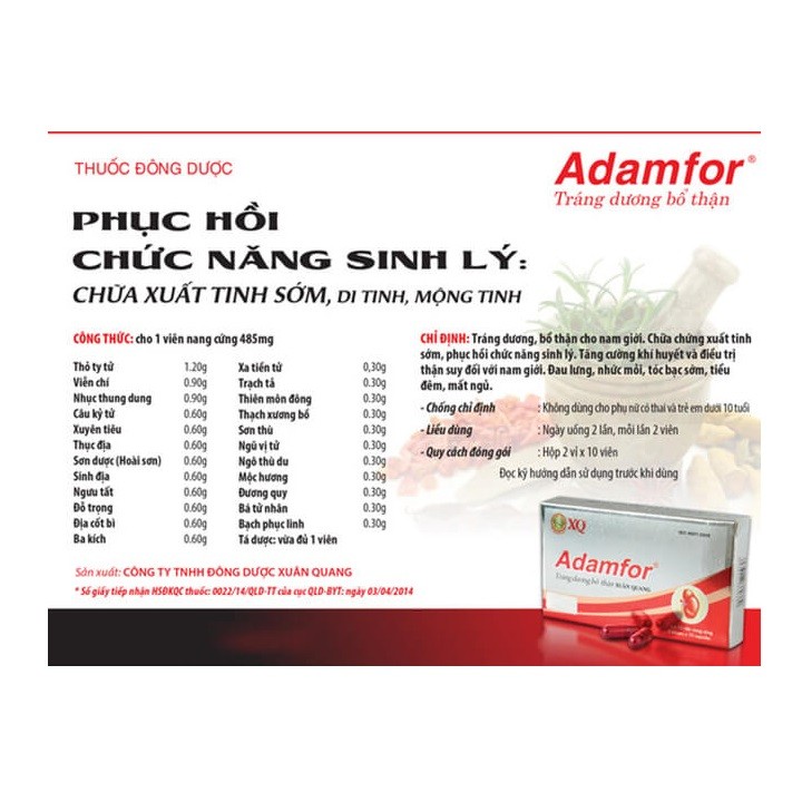 viên uống Adamfor Giúp bổ thận tráng dương , tăng cường sinh lý ở nam giớiThành phầnThỏ ty tử 1.20g; Xa tiền tử 0.30g; 98.000đ
