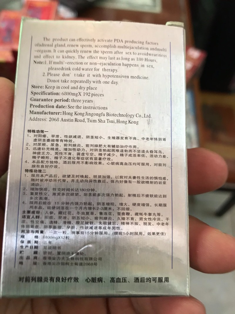 - Thành phần: Probides 50mg guranosterols, Korean Ginseng, Pregnenolone(10mg), Zinc(as oxide) 25mg, Ganoderma lucidum,Trái cây Wolferry, fron, Hsueh-lien-hua, Broomrape, Actinolite, Rùa yếm, Tinh hoàn của Bò Tây Tạng, Nhân sâm, Lông nhung