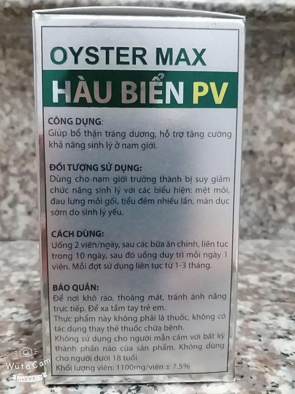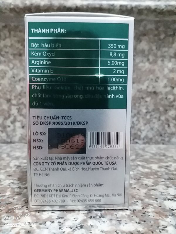 THÀNH PHẦN: Bột hàu biển .......... ..350mgKẽm oxyd.........8.8mgArginine. .......... 5.00mgVitamin E............2mgCoenzyme Q10............1.00mgPhụ liệu vừa đủ 1vCÔNG DỤNG:Giúp bổ thận tráng dươngHỗ trợ tăng cường khả năng sinh lý ở nam giới.ĐỐI TƯỢNG SỬ DỤNG:Dùng cho nam giới trưởng thành bị giảm chức năng sinh lý với các biểu hiện: mệt mỏi, đau lưng mỏi gối, tiểu đêm nhiều lần,Bệnh mãn dục sớm do sinh lý yếu.CÁCH DÙNG: Uống 2v ngày sau bữa ăn chính liên tục trong 10 ngày. Sau đó uống duy trì mỗi ngày 1vMỗi đợt dùng liên tục 1- 3 tháng.Chú ý: Ko dùng cho người dưới 18 tuổi.SẢN PHẨM NÀY KO PHẢI LÀ THUỐ.C KHÔNG CÓ TÁC DỤNG THAY THẾ THUỐ.C CHỮ.A BỆNH.SĐK : 4085/2019/ĐKSPHSD: 2022NSX: CTCPDP QUỐC TẾ USA