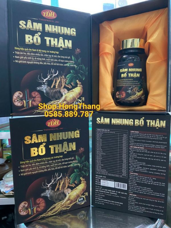 CHI TIẾT THÀNH PHẦN CÓ TRONG ẢNHSâm nhung bổ thậnthành phần:Ba kíchMacaBạch tật lêNhng huuBột hàuĐông trùng hạ thảo..........thành phần chính của sản phẩm bao gồm các vị thảo dược tự nhiên như nhunghuuu , ba kích, cam thảo, hoài sơn, đẳng sâm, bạch linh…giúp tăng cường chức năng thận, cố tinh, cải thiện sinh lý namhỗ trợ đị các triệu chứng của thận hư như đau lưng, mỏi gối, đau mỏi xương khớpkích thích ham muốn tình dục, tăng hưng phấn khi quan hệcải thiện các chứng di tinh, mộng tinh, xuất tinh sớm, liệt dương ở nam giớicách sử dụngmỗi ngày uống 1lần x 1-2 viên/ lần. dùng sản phẩm liên tục trong 2 -5 tháng để thấy được hiệu quả tốt nhất.Sử dụng sau bữa ăn 30-1h phútchống chỉ định