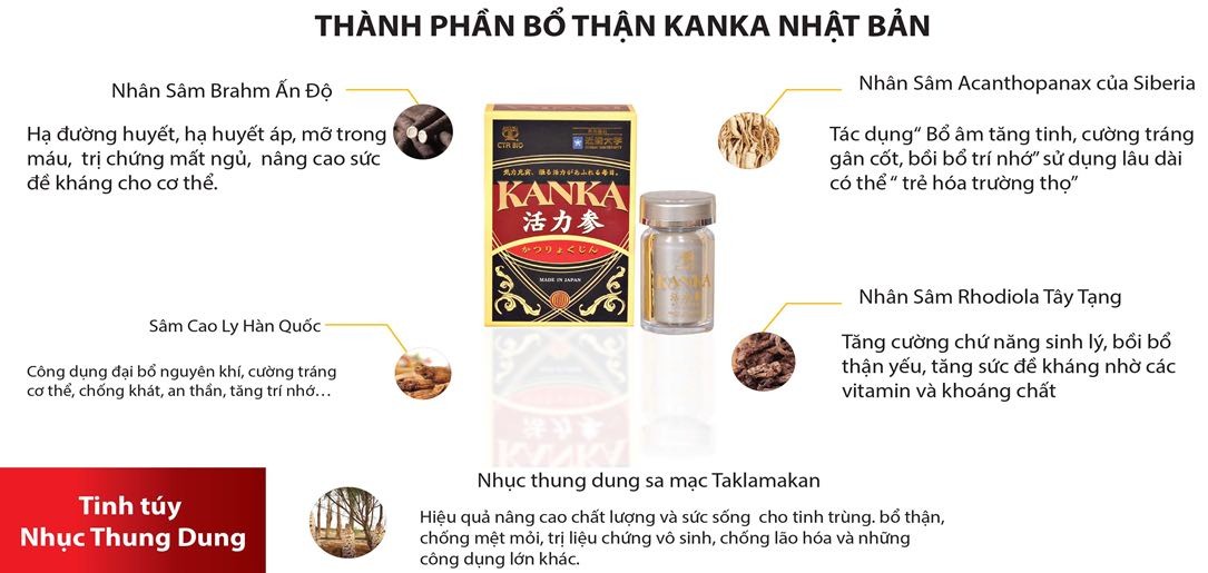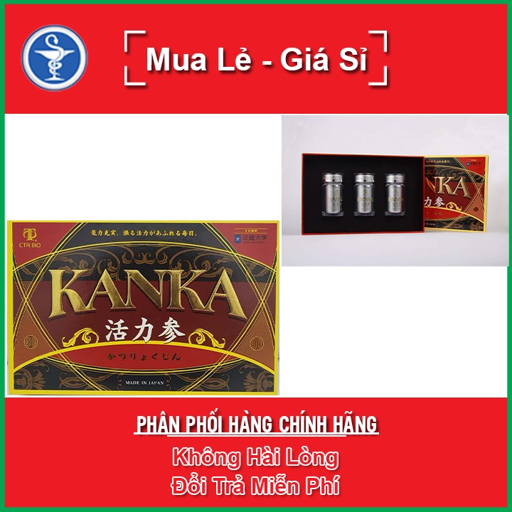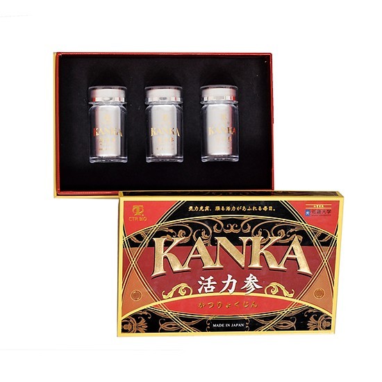 ❤️ QUY CÁCH: Hộp 180 viên (3 Lọ x 60 viên)❤️ THÀNH PHẦN TRONG KANKA KATSUKYOKUJIN: ➤ Chiết xuất từ: Nhục Thung Dung, Sâm Cau, Nhân Sâm Siberia, Nhân Sâm Thổ Cao Ly, Nhân Sâm Tây Tạng Rhodiola, Nhân Sâm Braham Ấn Độ, Bach Quả, Cellulose, Chất nhũ hóa (E473), Chất mang (E551). ❤️ ĐỐI TƯỢNG SỬ DỤNG KANKA KATSUKYOKUJIN: