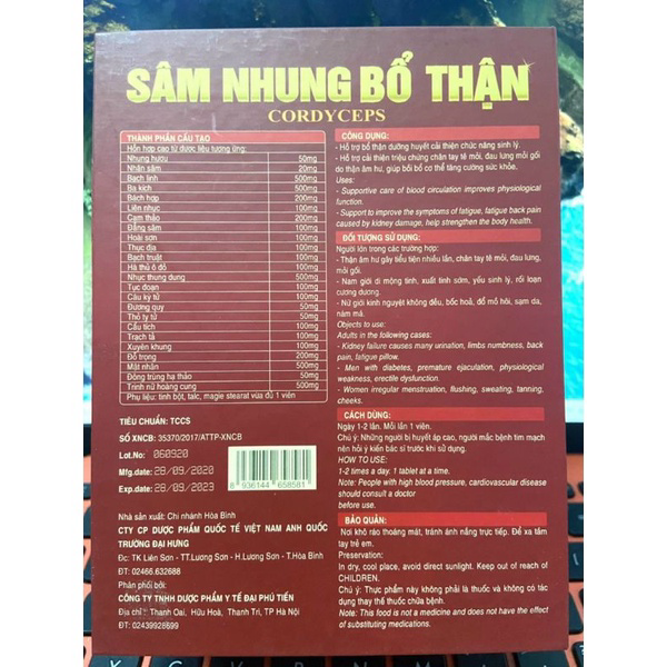 Sản phẩm này không phải là thuốc và không có tác dụng thay thế thuốc chữa bệnhCHI TIẾT THÀNH PHẦN CÓ TRONG ẢNHSâm nhung bổ thậnthành phần:Ba kíchMacaBạch tật lêNhung hưuBột hàuĐông trùng hạ thảo..........thành phần chính của sản phẩm bao gồm các vị thảo dược tự nhiên như nhung hươu , ba kích, cam thảo, hoài sơn, đẳng sâm, bạch linhcông dụngsâm nhung bổ thận trung ương có thể dùng cho cả nam và nữ. với mỗi đối tượng thì sản phẩm có những tác dụng như sau:Nam giới:giúp tăng cường chức năng thận, cố tinh, cải thiện sinh lý namhỗ trợ điều trị các triệu chứng của thận hư như đau lưng, mỏi gối, đau mỏi xương khớpkích thích ham muốn tình dục, tăng hưng phấn khi quan hệcải thiện các chứng di tinh, mộng tinh, xuất tinh sớm, liệt dương ở nam giớicách sử dụngmỗi ngày uống 1-3 ần x -1 viên/ lần. dùng sản phẩm liên tục trong 2 -5 tháng để thấy được hiệu quả tốt nhất.Sử dụng trước bữa ăn 30 hoặc 1h sau khi ănchống chỉ địnhkhông dùng sâm nhung bổ thận cho các trường hợp sau:người bị dị ứng hay mẫn cảm với bất kì thành phần nào của thuốcNữ giới:Giúp đạt được tình trạng sung mãn về thể chất và tinh thần.- Giúp tăng cường chức năng của thận.- Giúp cải thiện các triệu chứng do thiếu hụt nội tiết Estrogen ở phụ nữ: Khô âm đạo, giảm ham muốn tình dục, tích mỡ bụng, xuống sắc, bốc hỏa, mất ngủ, loãng xương.- Giúp điều hòa kinh nguyệt.Đối tượng sử dụngNữ giới chức năng sinh lý suy giảm, khô âm đạo, giảm ham muốn tình dục. Nữ giới tuổi tiền mãn kinh, mãn kinh có các triệu chứng: bốc hỏa, mất ngủ, tích mỡ bụng, loãng xương, da nhăn, sạm, nám, tóc khô xơ, dễ rụng. Nữ giới chức năng thận suy giảm: Đi tiểu nhiều về đêm, thận yếu, các bệnh lý về thận làm suy giảm chức năng của thận,Nữ giới kinh nguyệt không đều.