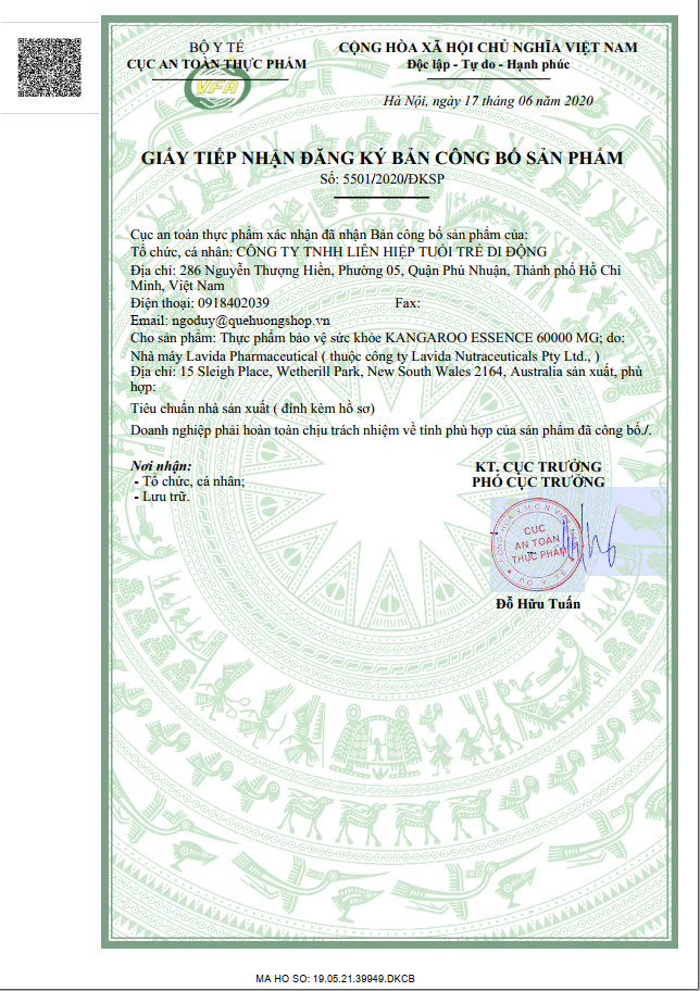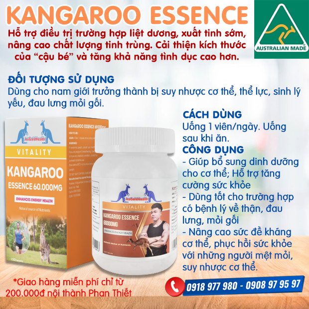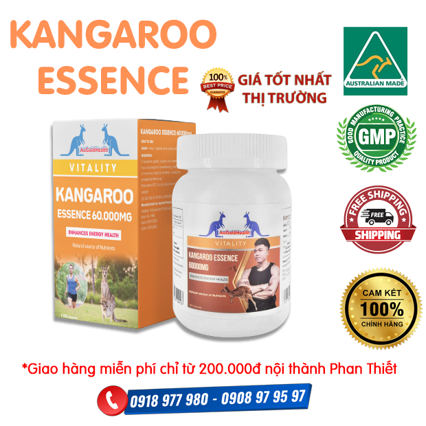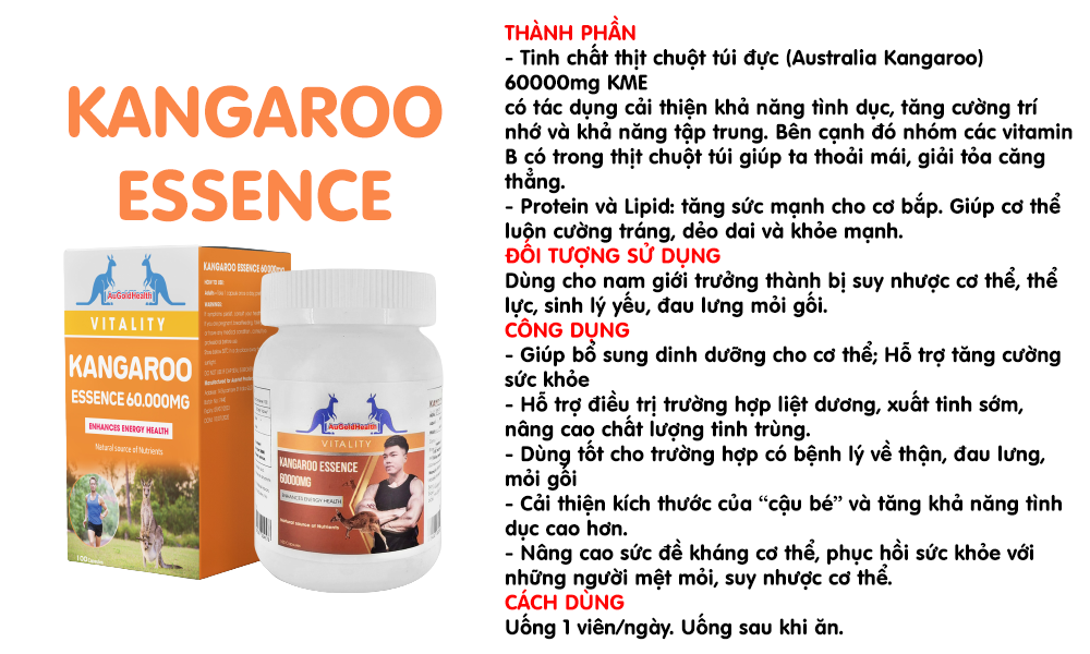Viên uống tăng cường sinh lý nam giới KANGAROO ESSENCE 60000mg (AuGoldHealth)—————————————Tinh chất thịt chuột túi đực (Australia Kangaroo) 60000mg KME- Theo nghiên cứu, thịt chuột túi là một trong những loại thịt có lượng protein lớn nhất trong khi đó lượng chất béo chỉ chiếm dưới 2%. Điều này có tác dụng trong việc tăng cường cơ bắp, đốt cháy calo mà đặc biệt hơn là rất tốt để tăng cường sinh lực trong sinh hoạt vợ chồng. Thịt kangaroo còn chứa CLA có tính chất chống oxy hóa làm tăng cường sức đề kháng.- Đối với nam giới, chúng còn có tác dụng cải thiện khả năng tình dục, tăng cường trí nhớ và khả năng tập trung. Bên cạnh đó nhóm các vitamin B có trong thịt chuột túi giúp ta thoải mái, giải tỏa căng thẳng.- Đặc biệt vitamin B5, B6 còn có thể cân bằng nồng độ hormone trong cơ thể nam giới. Theo bảng tiêu chuẩn dinh dưỡng của Mỹ, mỗi ngày đàn ông cần 15mg kẽm để cải thiện các vấn đề do yếu sinh lí gây ra và thịt chuột túi là một nguồn cung cấp phong phú các khoáng chất đặc biệt là kẽm cần thiết cho sự tăng trưởng, giảm đau và xây dựng hệ thống miễn dịch mạnh khỏe, hỗ trợ hiệu quả cho các vấn đề về sinh lý.Protein và LipidTham gia vào nhiều quá trình chuyển hoá của cơ thể, tăng cường sản sinh năng lượng cho tế bào, tăng sức mạnh cho cơ bắp. Giúp cơ thể luôn cường tráng, dẻo dai và khỏe mạnh.
