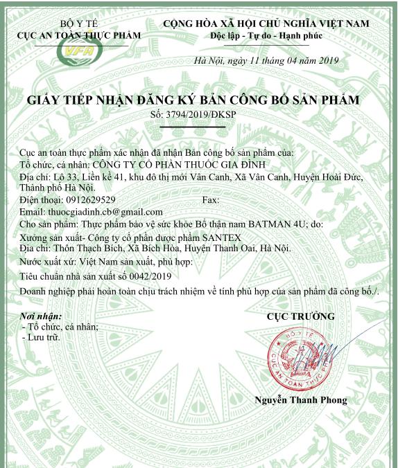 - L-Arginine HCL...........: 100 mg - Kẽm Gluconat..............: 50 mg- Bá bệnh........................: 500mg- Cao Dâm dương hoắc: 200 mg- Cao Ba Kích: ………: 150 mg- Nhân Sâm ...............: 120 mgBạch tật lê................: 120 mgCâu kỷ tử..................: 120 mgNhục thung dung.......: 100 mgTrâu cổ ......................: 100 mgSâm cau ....................: 100mgThỏ ti tử......................: 50mgĐỗ trọng......................: 30mgCam Thảo ..................: 10mgĐông trùng hạ thảo.....:20mCao Lộc Nhung ……: 100 mgChiết Xuất Trứng Kiến.........10mgChiết Xuất Hàu Biển ........50mgThành phần khác: Glatin, glycerin, dầu nành, sorbitol vừa đủ một viên nang mềmCông dụng:Giúp bổ thận tráng dương, tăng cường chức năng sinh lý nam.
