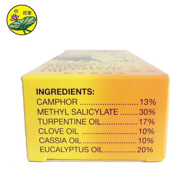 Camphor (Long não): 13%, Methyl Salicylate: 30%, Turpentine oil 17%, Clove oil 10%, Cassia oil: 10%, Eucalyptus oil: 20%.