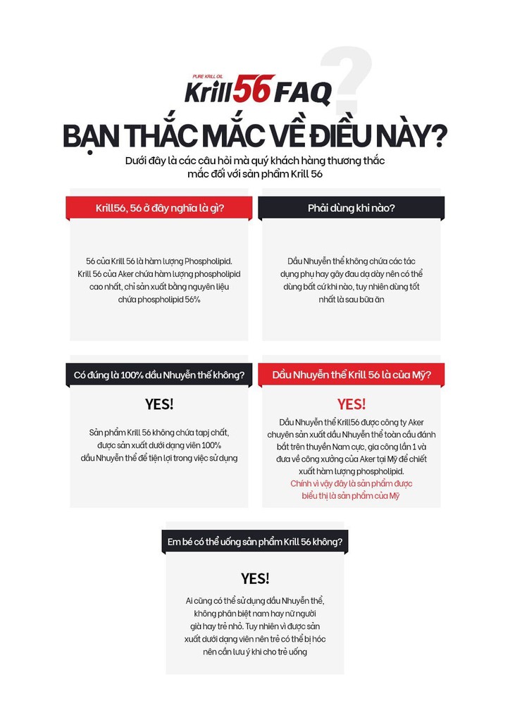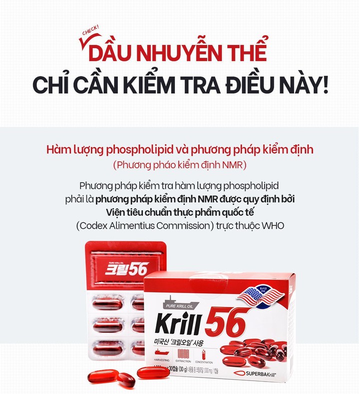 Dầu nhuyễn thể Krill 56 Superba Krill được chiết xuất từ loài nhuyễn thể từ vùng Nam Cực, sống ở tầng đáy đại dương Nam Cực. Chúng sống ở vùng nguyên sơ nên không bị nhiễm độc chì như cá. Chúng chứa nhiều chất dinh dưỡng bao gồm chuỗi Omega- 3 (EPA&DHA), phospholipids, choline, astaxanthin