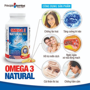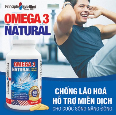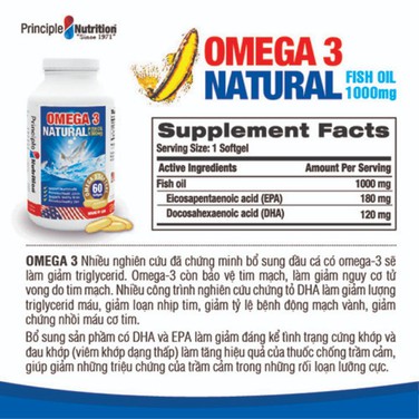 Viên uống dầu cá tự nhiên Omega 3 Natural Fish Oil 1000mg PRINCIPLE NUTRITION USA bổ sung các chất béo không no hỗ trợ sức khỏe xương khớp tim mạch giúp chống lão hóa giảm trầm cảm giúp dễ ngủ và cải thiện sự tập trung - Hộp 60 viên