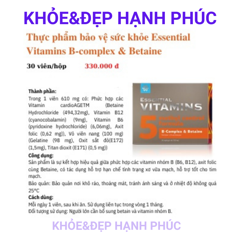 [Hỗ trợ tim mạch] Thực phẩm bảo vệ sức khỏe Essential Vitamins B-complex & Betaine – 30 viên – Date T3/2023