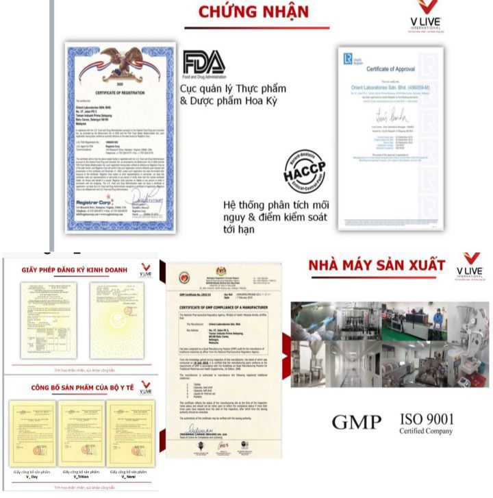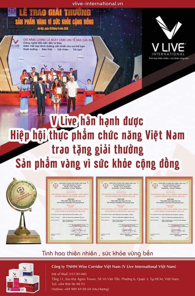 Bộ 3 thực phẩm dinh dưỡng tế bào V Live V1. Hiệp hội thực phẩm chức năng trao tặng HUY CHƯƠNG VÀNG vì sức khỏe cộng đồng, Chứng nhận Bộ thực phẩm và dược phẩm HOA KỲ. Sản xuất tại Malaysia theo công nghệ ĐỨC