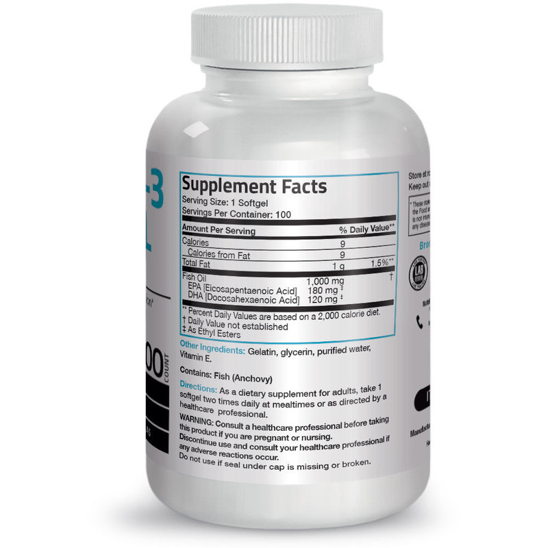 *Omega3 1000mg được biết đến với nhiều công dụng như hỗ trợ hệ tuần hoàn và tim mạch, cải thiện thị giác, ngăn ngừa các dấu hiệu lão hóa trên da, làm giảm nguy cơ đột quỵ cũng như hỗ trợ kìm hãm sự lão hóa các tế bào não, giúp duy trì và cải thiện trí nhớ, cho bạn luôn có một cơ thể khỏe mạnh, tinh thần minh mẫn.*Đối tượng sử dụng:- Dùng cho người trưởng thành cần bổ sung Omega3 *Thành phần:- Omega3 1000mg*Công dụng:- Giúp cải thiện thị lực, cho mắt luôn khỏe mạnh- Hỗ trợ hệ tuần hoàn và tim mạch- Ngăn ngừa các dấu hiệu lão hóa trên da- Làm giảm nguy cơ đột quỵ cũng như hỗ trợ kìm hãm sự lão hóa các tế bào não*Liều dùng:- Uống 1 viên ngày sau bữa ăn.*Thông số sản phẩm:- Quy cách: Chai 100 viên- Xuất xứ: BRONSON - MỸ*Sản phẩm đạt Chứng nhận Thực phẩm chức năng Organic USDA và được HIỆP HỘI Y KHOA MỸ (AMA) khuyên dùng