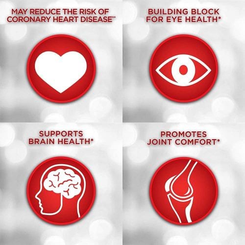 Omega-3 hỗ trợ 4 lĩnh vực sức khỏe quan trọng: Tim (làm giảm nguy cơ mắc bệnh tim mạch vành), Khớp (thúc đẩy sự vận động thoải mái của khớp), Não (hỗ trợ sức khỏe và chức năng não bộ) và Mắt (khối xây dựng cho sức khỏe của mắt, giúp mắt sáng khỏe, tinh anh).
