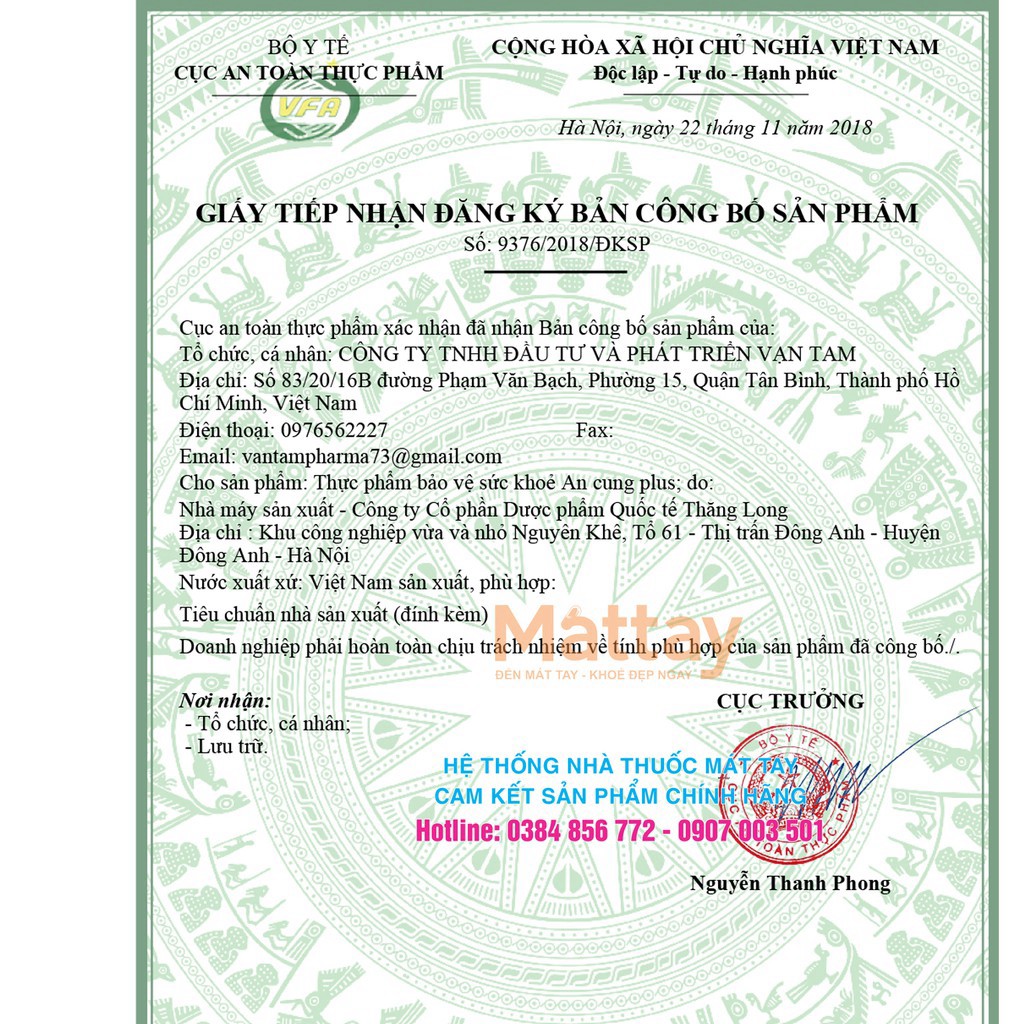 ⭐️ Hệ thống nhà thuốc Mát Tay rất vui vì bạn đã tham quan cửa hàng của chúng tôi. Chúng tôi cam kết tất cả các sản phẩm của Hệ thống nhà thuốc Mát Tay phân phối 100% sản phẩm chính hãng, giá bán chuẩn nhất thị trường, nếu bạn phát hiện sản phẩm của chúng tôi cung cấp không phải chính hãng chúng tôi xin hoàn gấp đôi số tiền mà bạn đã đặt mua tại cửa hàng của chúng tôi. Trong quá trình sử dụng sản phẩm bạn có thắc mắc hoặc cần tư vấn về sức khỏe hay sản phẩm xin vui lòng gọi qua zalo số điện thoại 0907003501 hoặc 0384856772 đội ngũ dược sĩ đại học trên 10 năm kinh nghiệm của chúng tôi rất vinh dự được phục vụ bạn.⭐️ Quy cách :⭐️ Xuất xứ : ⭐️ Thành phần : Trong mỗi viên nén có chứa: • Rutin...................................................50mg • Cao Địa long (Pheretima)...................50mg • Tỏi đen (Allium sativum).....................50mg • Cao Đan sâm (Salvia miltiorrhiza)......50mg • Bạch quả (Ginkgo biloba)...................40mg • Coenzym Q10.....................................30mg • Nattokinase.......................................500FU • Vitamin B6..........................................2,5mg • Vitamin B1..........................................1,5mg • Phụ liệu: Cellulose vi tinh thể, Cellulose, Polyvinylpyrolidon (PVP), Talc, Hydroxylpropyl methyl cellulose (HPMC), Polyethylene Glycol 6000, Magie stearat, Primojel, Titanium Dioxide vừa đủ. (Khối lượng tịnh/ viên: 1300 mg ± 7.5%)⭐️ Công dụng : • Hỗ trợ hoạt huyết, giúp làm giảm nguy cơ tai biến mạch máu não do tắc mạch ⭐️ Cách dùng : Ngày uống 2-3 lần, mỗi lần 2 viên, uống trước bữa ăn 30 phút hoặc sau khi ăn 1 giờng ⭐️ Đối tượng sử dụng : Người có tiền sử hoặc có nguy cơ tắc mạch máu do cục máu đông Người sau tai biến mạch máu não do tắc mạch 🚫 Chú ý : - Sản phẩm này không phải là thuốc, không có tác dụng thay thế thuốc chữa bệnh. - Không sử dụng cho người có mẫn cảm với bất kỳ thành phần nào của sản phẩm.- Đọc kĩ hướng dẫn sử dụng trước khi dùng. 💕 Sản phẩm hiện có bán tại Hệ Thống Mát Tay 💕 o MÁT TAY SỐ 1: 210 BẠCH ĐẰNG, TP QUY NHƠN. o MÁT TAY SỐ 2: 05B TĂNG BẠT HỔ, TP QUY NHƠN. o MÁT TAY SỐ 3: NGÃ 3 ĐIỆN BIÊN PHỦ – TRƯƠNG VĨNH KÝ, TP QUY NHƠN. o MÁY TAY SỐ 6: 03 LÊ THANH NGHỊ, KHU BẮC SÔNG HÀ THANH, TP QUY NHƠN. Điện thoại: 0907.033.501 – 0384.856.722. ⭐️ An Cung Plus H/30V- Vạn Tam#ANCUNGPLUS#AN_CUNG_PLUS#ancungplus#an_cung_plus#Hỗtrợhoạthuyết#Hỗ_trợ_hoạt_huyết#hotrohoathuyet#ho_tro_hoat_huyet#giảmnguycơ#giảm_nguy_cơ#giamnguyco#giam_nguy_co#taibiếnmạchmáunão#tai_biến_mạch_máu_não#taibienmachmaunao#tai_bien_mach_mau_nao#máttay#mattay[mát tay online]