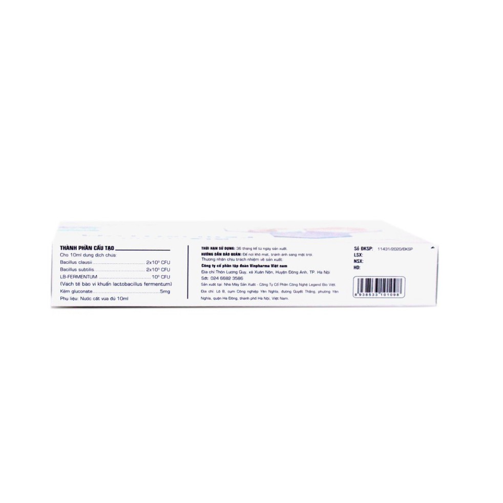 📌Thành phầnống 10ml dung dịch chứa:✔️Bacillus clausii 2x109 CFU✔️Bacilus subtilis 2x109 CFU✔️LB-Fermentum  109 CFU✔️Kẽm gluconate  5mgPhụ liệu: Nước cất vừa đủ 10ml📌Công dụng✔️Giúp bổ sung lợi khuẩn, giúp cải thiện hệ vi sinh đường ruột, hỗ trợ cải thiện triệu chứng và giảm nguy cơ rối loạn tiêu hóa do loạn khuẩn đường ruột.✔️Hỗ trợ tăng cường tiêu hóa, giúp ăn ngon miệng.📌Đối tượng sử dụng⭐Người bị rối loạn tiêu hóa do loạn khuẩn đường ruột với các biểu hiện: tiêu chảy, phân sống, đầy bụng, ợ hơi, ợ chua, ăn uống khó tiêu.⭐Người dùng kháng sinh kéo dài hoặc kháng sinh liều cao gây rối loạn khuẩn đường ruột.⭐Người chán ăn, hấp thụ kém.📌Cách dùng🔰Lắc đều trước khi sử dụng👶Trẻ 0 – 1 tháng tuổi👉Uống 10ml (1 ống)/ngày, chia 2 lần, tham khảo ý kiến dược sỹ, bác sỹ trước khi dùng.👧Trẻ từ 1 – 6 tuổi👉Ngày uống 1 lần, Mỗi lần uống 10ml (1 ống)👩Trẻ trên 6 tuổi và người lớn👉Ngày uống 2 lần, Mỗi lần uống Uống 10ml (1 ống)✨Uống trược tiếp trong ống hoặc hòa với đường, sữa, nước cam✨Có thể nhìn thấy các hạt nhỏ trong ống do sự tập hợp của các bào tử men, điều đó chỉ ra rằng sản phẩm không bị thay đổi về chất lượng.🌟Lưu ý khi sử dụng⭐⭐⭐Sản phẩm khôngphảilàthuốc và không có chức năng thaythếthuốc⭐⭐⭐💥💥💥Dùng được cho phụ nữ mang thai, phụ nữ cho con bú và trẻ em.💥💥💥⭕Không dùng cho người mẫn cảm với bất kì thành phần nào của sản phẩm.📌Bảo quản👉Bảo quản nơi khô mát, tránh ánh nắng mặt trời#menvisinh#men_vi_sinh#bosungloikhuan #bo_sung_loi_khuan#tangcuongtieuhoa#tang_cuong_tieu_hoa#giup_an_ngon_mieng#giupanngonmieng
