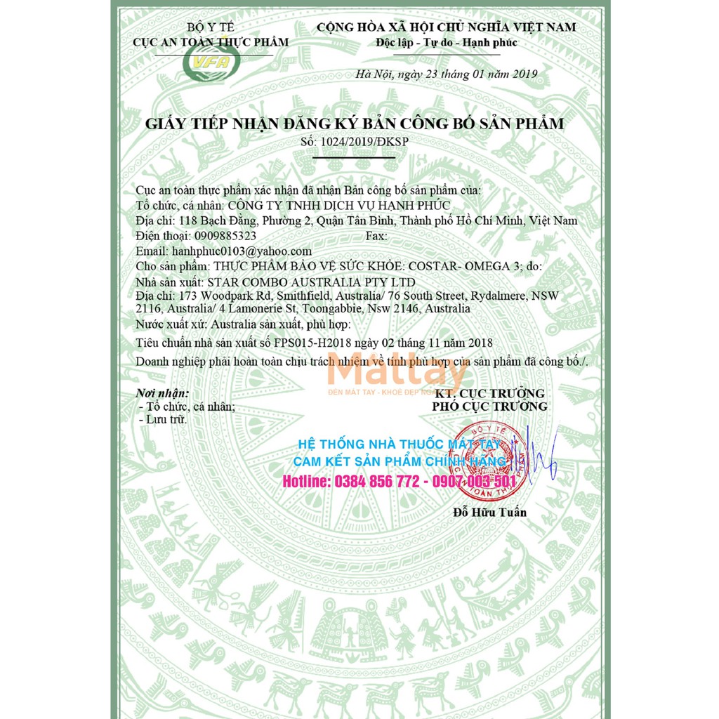 ⭐️ Hệ thống nhà thuốc Mát Tay rất vui vì bạn đã tham quan cửa hàng của chúng tôi. Chúng tôi cam kết tất cả các sản phẩm của Hệ thống nhà thuốc Mát Tay phân phối 100% sản phẩm chính hãng, giá bán chuẩn nhất thị trường, nếu bạn phát hiện sản phẩm của chúng tôi cung cấp không phải chính hãng chúng tôi xin hoàn gấp đôi số tiền mà bạn đã đặt mua tại cửa hàng của chúng tôi.Trong quá trình sử dụng sản phẩm bạn có thắc mắc hoặc cần tư vấn về sức khỏe hay sản phẩm xin vui lòng gọi qua zalo số điện thoại 0907003501 hoặc 0384856772 đội ngũ dược sĩ đại học trên 10 năm kinh nghiệm của chúng tôi rất vinh dự được phục vụ bạn.⭐️ Quy cách : Chai 100 viên.⭐️ Xuất xứ : Úc.⭐️ Thành phần :- Dầu cá tự nhiên.Thành phần khác:D-Alpha Tocopherol, Gelatin,Glycerol, nước tinh khiết- Công dụng: Bổ sung EPA và DHA, hỗ trợ sức khỏe tim mạch, tốt cho mắt.- Đối tượng sử dụng: Dùng cho người trưởng thành.- Cách dùng: Uống 1 viên mỗi ngày.🚫 Chú ý :- Không dùng cho trẻ em.- Không dùng cho những người bị hen suyễn và bị dị ứng với phấn hoa- Sản phẩm này không phải là thuốc, không có tác dụng thay thế thuốc.- Không sử dụng cho người có mẫn cảm với bất kỳ thành phần nào của sản phẩm.- Đọc kĩ hướng dẫn sử dụng trước khi dùng.💕 Sản phẩm hiện có bán tại Hệ Thống Mát Tay 💕o MÁT TAY SỐ 1: 210 BẠCH ĐẰNG, TP QUY NHƠN.o MÁT TAY SỐ 2: 05B TĂNG BẠT HỔ, TP QUY NHƠN.o MÁT TAY SỐ 3: NGÃ 3 ĐIỆN BIÊN PHỦ – TRƯƠNG VĨNH KÝ, TP QUY NHƠN.o MÁY TAY SỐ 6: 03 LÊ THANH NGHỊ, KHU BẮC SÔNG HÀ THANH, TP QUY NHƠN.Điện thoại: 0907.033.501 – 0384.856.722.