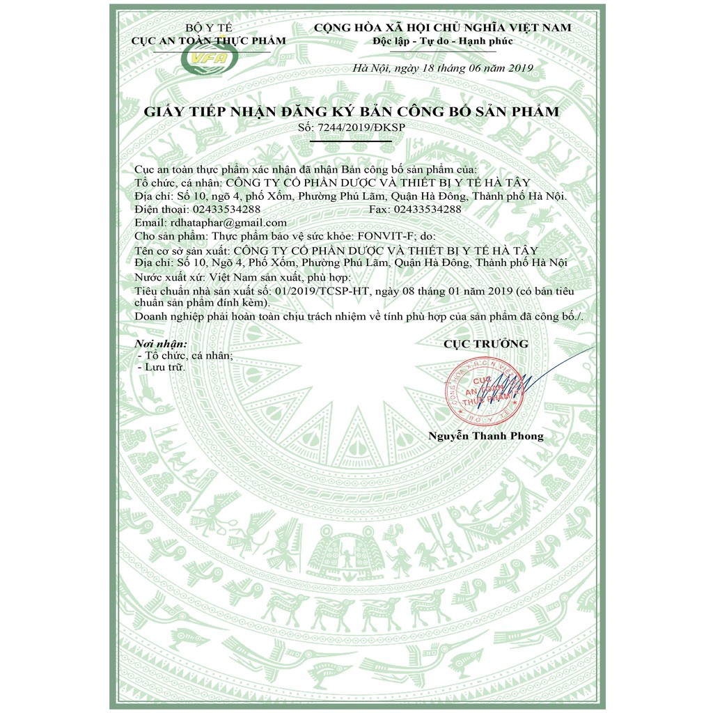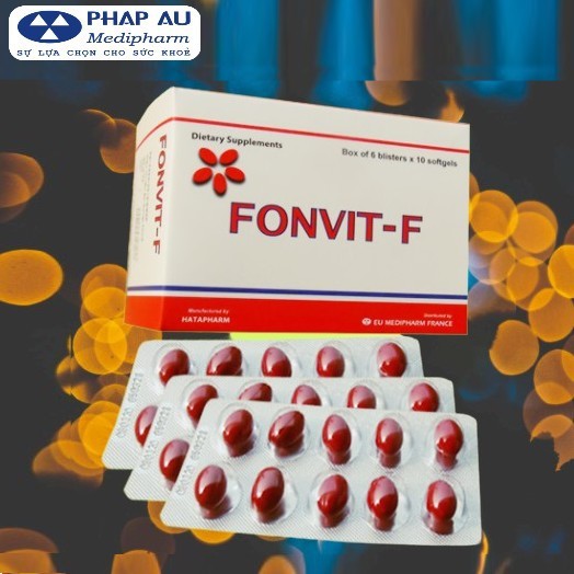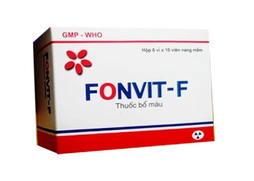 TÊN SẢN PHẨM: FONVIT F* THÀNH PHẦN:Sắt (II) fumarat: 60mgVitamin B12: 2mcgAcid folic: 250mcg* CÔNG DỤNG: - Hỗ trợ các trường hợp thiếu máu do thiếu cung cấp hoặc mất chất sắt và các yếu tố tạo máu. Các trường hợp tăng nhu cầu tạo máu như ở phụ nữ có thai, cho con bú, người suy dinh dưỡng, thời kỳ hậu phẫu, giai đoạn phục hồi sau bệnh nặng.* ĐỐI TƯỢNG SỬ DỤNG: Phụ nữ có thai, cho con bú, người thiếu máu, suy dinh dưỡng, thời kỳ hậu phẫu, giai đoạn phục hồi sau bệnh nặng.* CÁCH DÙNG VÀ LIỀU DÙNG: - Uống trước bữa ăn.- Người lớn và trẻ em trên 6 tuổi: Uống 1-2viên /ngày * QUY CÁCH: Hộp 6 vỉ x 10 viên nang mềm