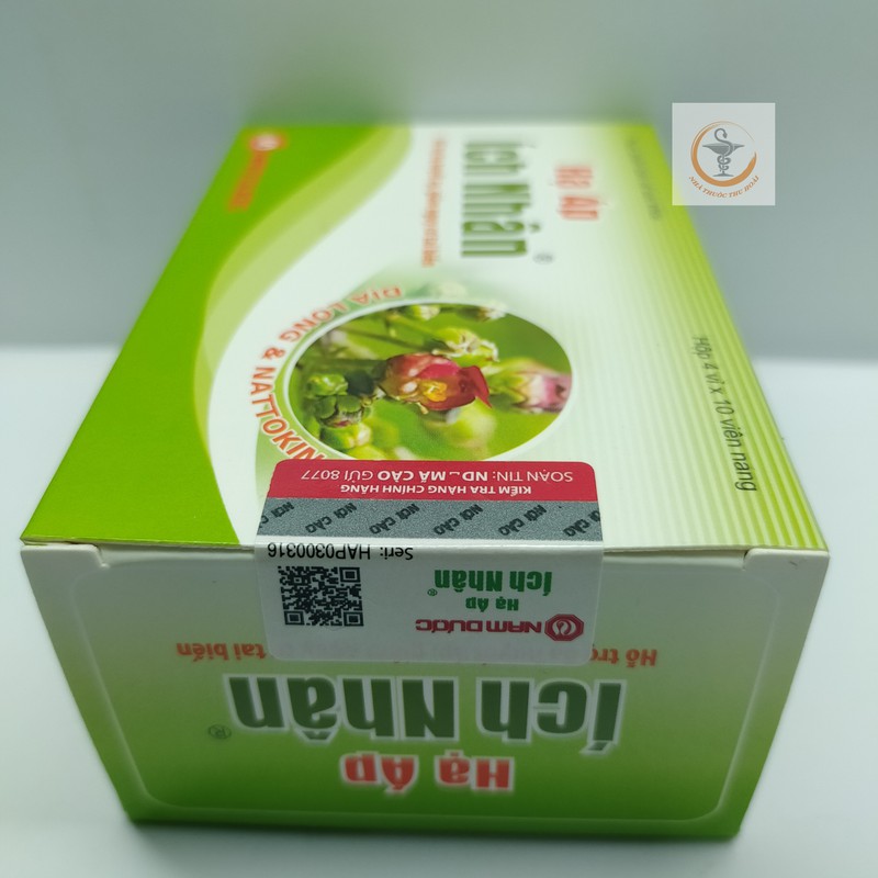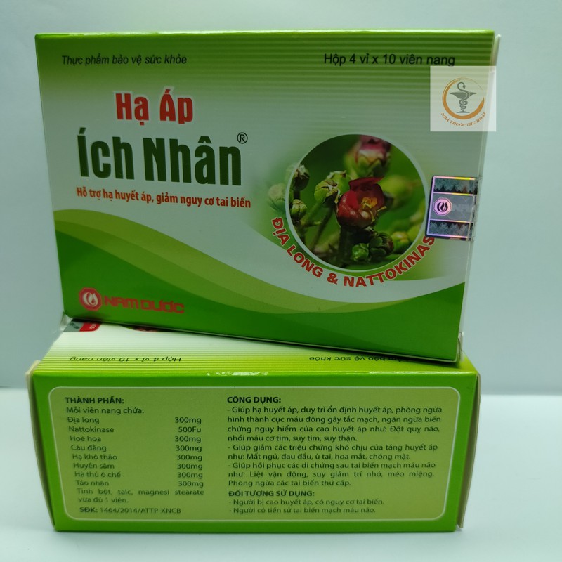 TPCN Hạ Áp Ích Nhân là một thực phẩm chức năng do Công ty Nam Dược sản xuất. Sản phẩm được sản xuất từ các thành phần chính là Địa long, Hòe hoa, Nattokinase và bài thuốc Giáng áp hợp tễ (bao gồm Câu đằng, Hạ khô thảo, Huyền sâm, Hà thủ ô chế, Táo nhân)… Đây là những thành phần hữu ích giúp hạ huyết áp và ổn định huyết áp lâu dài.