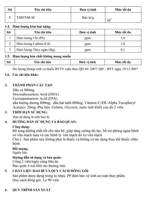 1.Thành phần:Dầu cá 800mg(Docosahexaenoic Acid (DHA).Eicosapentaenoic Acid (EPA).Dầu hướng dương 800mg.Dầu hạt lanh 800mg.Vitamin E (DL - Alpha Tocophery Acetate) 200mg.Phụ liệu: Gelatin, Glycerin, Nước tinh khiết vừa đủ hai viên