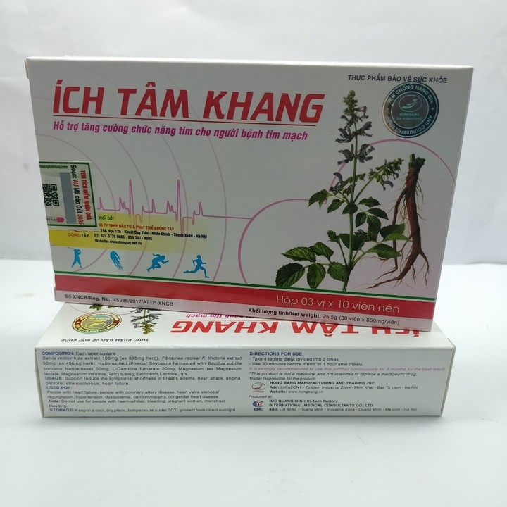 Ích Tâm Khang là sản phẩm được bào chế từ thảo dược dành cho các trường hợp liên quan đến tim như: Hẹp mạch vành, nhồi máu cơ tim, đau thắt ngực.Thành Phần Ích Tâm Khang:+ Cao Natto: 50mg+ Cao Đan sâm: 100mg+ Cao Vàng đằng: 50mg+ L – Carnitine: 20mgCông Dụng Ích Tâm Khang:Giúp phòng ngừa suy tim.Hỗ trợ đ.ieu t.rị suy tim:Làm giảm nhanh các triệu chứng của suy tim, suy tim sung huyết như mệt mỏi, khó thởm ho, phù, xanh xao, hồi hộp.Làm chậm tiến trình suy tim, giúp cải thiện tuần hoàn mạch vành nhằm giảm đau thắt ngực.Giúp tăng cường sức khỏe tim mạch nên cải thiện chất lượng cuộc sống và kéo dài tuổi thọ của bệnh nhân suy tim.Cách Dùng Ích Tâm Khang:- Hỗ trợ đ.ieu t.rị suy tim: Ngày uống 2 lần, mỗi lần 2 viên- Phòng ngừa suy tim: Ngày uống 1 lần 2 viên.- Nên uống trước bữa ăn 30 phút hoặc sau khi ăn 1 giờ.- Nên dùng theo đợt liên tục từ 4 – 6 tháng để có kết quả tốt.*Lưu ý:- Tác dụng của sản phẩm tùy thuộc vào cơ địa của từng người