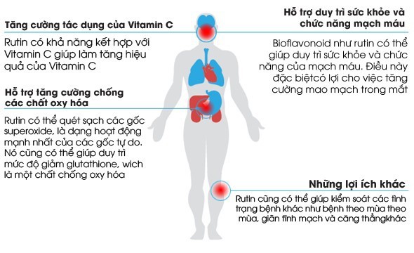 -kết hợp Rutin và Vitamin C để tăng cường sự hấp thụ vitamin C của cơ thể, hỗ trợ chức năng của Vitamin C trong quá trình kích hoạt hệ miễn dịch. Sự kết hợp này còn đặc biệt hiệu qủa trong việc bảo vệ sức khỏe và chức năng mắt.