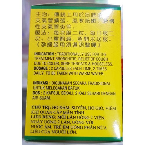 Công dụng:Ho đàm, suyễn, ho gió, viêm khí quản cấp và mãn tính.Cách sử dụng:Ngày dùng 2 lần, lần 2 viên.Trẻ em dùng liều phân nữa.