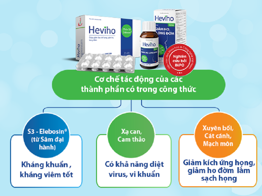 Heviho dành cho viêm họng cấp và mạn tính, giúp giảm đau rát họng, giảm ho, long đờm.