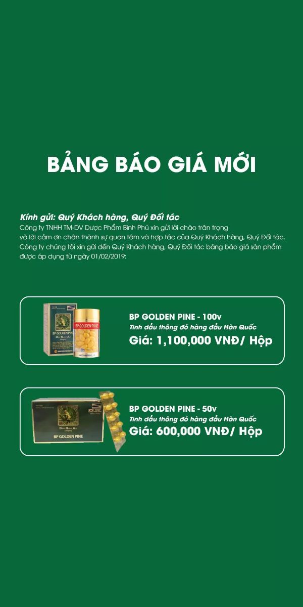 TINH DẦU THÔNG ĐỎ BP GOLDEN PINE Tinh dầu thông đỏ hàng đầu Hàn Quốc --------THÀNH PHẦN CHÍNH - Tinh dầu thông đỏ …..441 mg - Vitamin E .......................9 mg Phụ liệu vừa đủ 1 viên.CÔNG DỤNG:Tinh dầu thông đỏ BP Golden Pine được chiết xuất bằng công nghệ SD (Steam Distillation) có công dụng THÔNG HUYẾT MẠCH, từ đó giúp:- Hỗ trợ giảm xơ vữa động mạch- Ổn định huyết áp- Giảm nguy cơ đột quỵ- Giảm đường huyết và ngăn ngừa các biến chứng bệnh tiểu đường.- Hỗ trợ giảm mỡ trong máu.- Tăng cường miễn dịch.ĐỐI TƯỢNG SỬ DỤNG BP GOLDEN PINE:- Người có nguy cơ tim mạch cao, cao huyết áp - Người có đường huyết cao.- Người tăng mỡ máu.CÁCH DÙNG BP GOLDEN PINE:- Ngày uống 2 lần, mỗi lần 1 viên, sau bữa ăn 30 phút.- Sử dụng liên tục từ 3-6 tháng để có kết quả tốt nhất.03 ĐIỂM KHÁC BIỆT CỦA TINH DẦU THÔNG ĐỎ BP GOLDEN PINE:- Là sản phẩm DUY NHẤT được nhập khẩu chính thức từ Hàn Quốc bảo hộ bởi tập đoàn SAMSUNG.- Ứng dụng công nghệ chiết xuất SD (steam distillation) giúp giữ trọn vẹn 100% tinh chất quý trong lá thông đỏ.- Lá thông lấy tại BOEUN COUNTY tỉnh Chungcheong Buk-do – nơi có chất lượng thông tốt nhất xứ Hàn.Tinh dầu thông đỏ BP GOLDEN PINE do công ty TNHH TM-DV DƯỢC PHẨM BÌNH PHÚ nhập khẩu trực tiếp từ thương hiệu hàng đầu HANKOOK ANDERSON Hàn Quốc.Đã được Cục ATVSTP cấp chứng nhận tiêu chẩn sản phẩm. Số CB: 21471/2017/ATTP-XNCBXuất xứ: Hàn QuốcCông ty sản xuất: BIO AVENUE – Tập đoàn HANKOOK ANDERSONĐịa chỉ: 652-19 Jugyang –dearo, Baegam –myeon, Cheoin-gu, Yongin-si, Gyeonggido, Korea.#Tinhdầuthôngđỏ_BP_Golden_Pine #Tinhdầu #chínhhãngcaocấpnhậpkhẩutừHànQuốc #Sản phẩmđượcbảotrợbởitậpđoànSamsung #tinhdầuthôngđỏhàngđầuHànQuốcZalo sỉ 0942004664