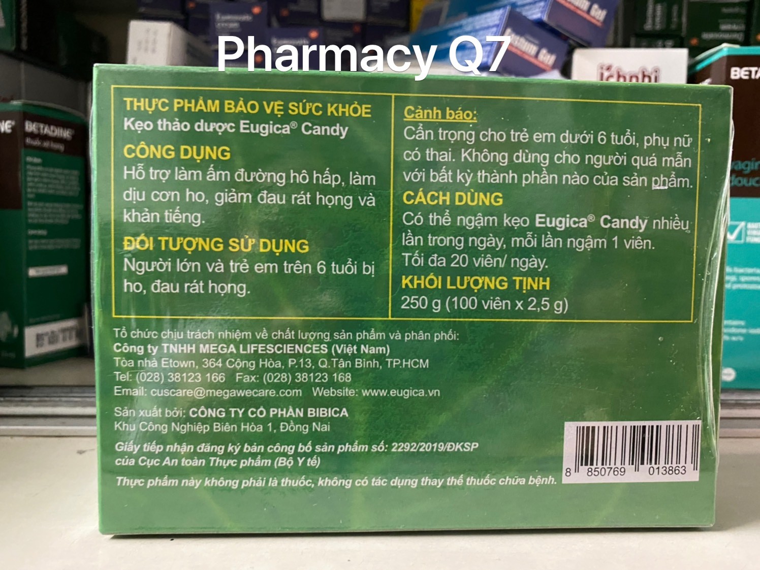 Chỉ định:Dùng làm ấm và thông cổ, giúp ngăn ngừa và làm dịu cơn ho, giảm đau rát họng và khản tiếng. Phòng ngừa các chứng ho khan, ho đờm.Liều dùng & cách dùng:Có thể ngậm kẹo Eugica nhiều lần trong ngày, mỗi lần ngậm 1 viên. Tối đa 20 viên/ngày.Bảo quản: Nơi khô ráo, nhiệt độ không quá 30 độ C.