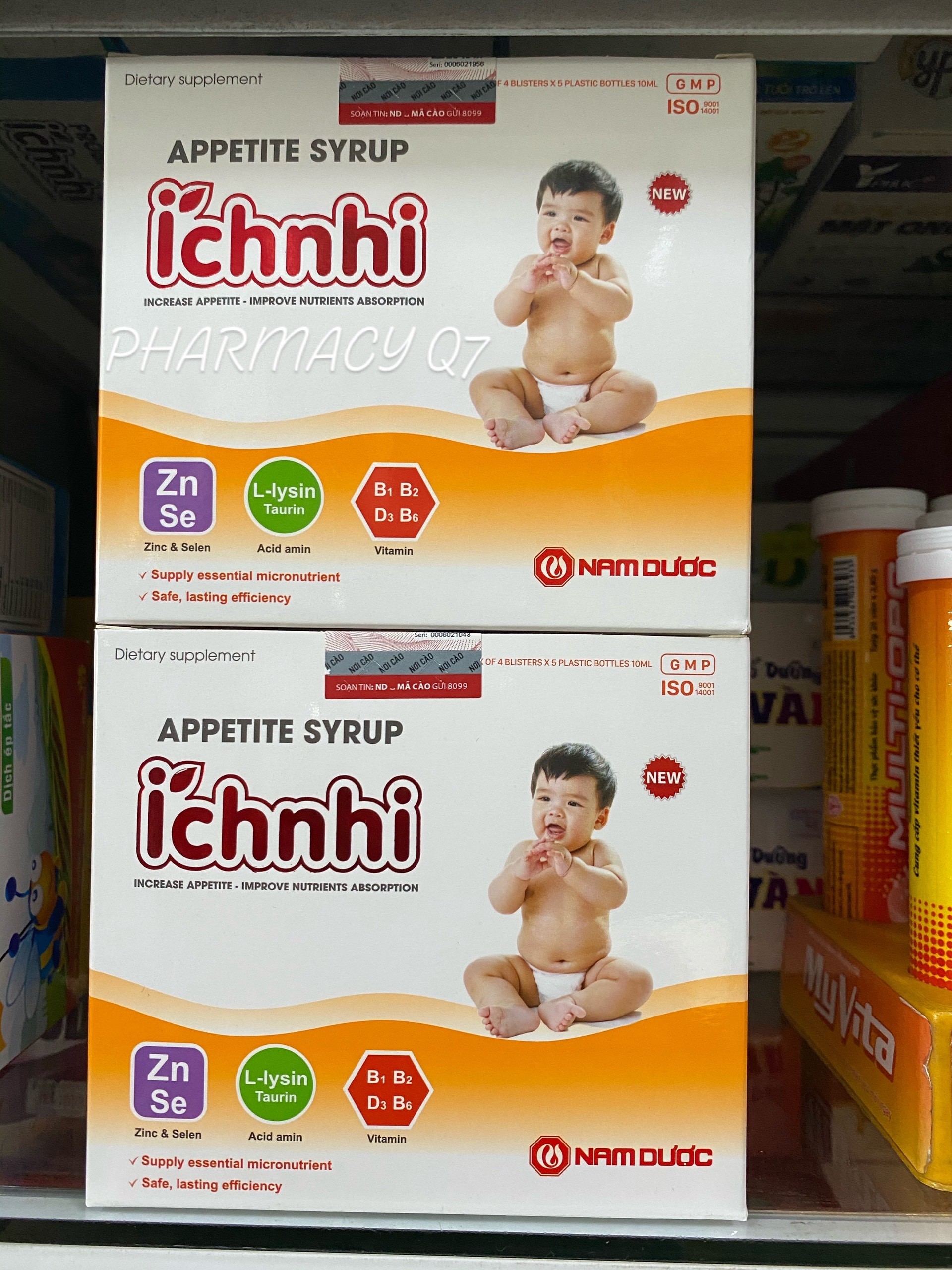 Kẽm có nguồn gốc thực vật ………….10mg Selen có nguồn gốc thực vật…………16mcg L – Lysine…………………………………..60mg Tarine ………………………………………5mg Vitamin B1 …………………………………0,6mg Vitamin B2 …………………………………0,6mg Vitamin B6 …………………………………0,3mg Vitamin D3 ………………………………200UI Calci gluconat …………………………120mg Thành phần khác ……………………vđ 10ml |