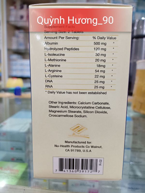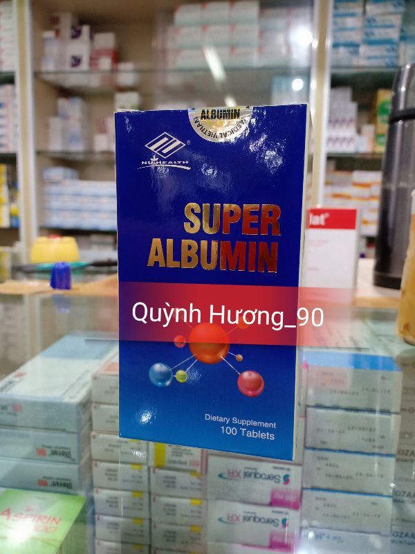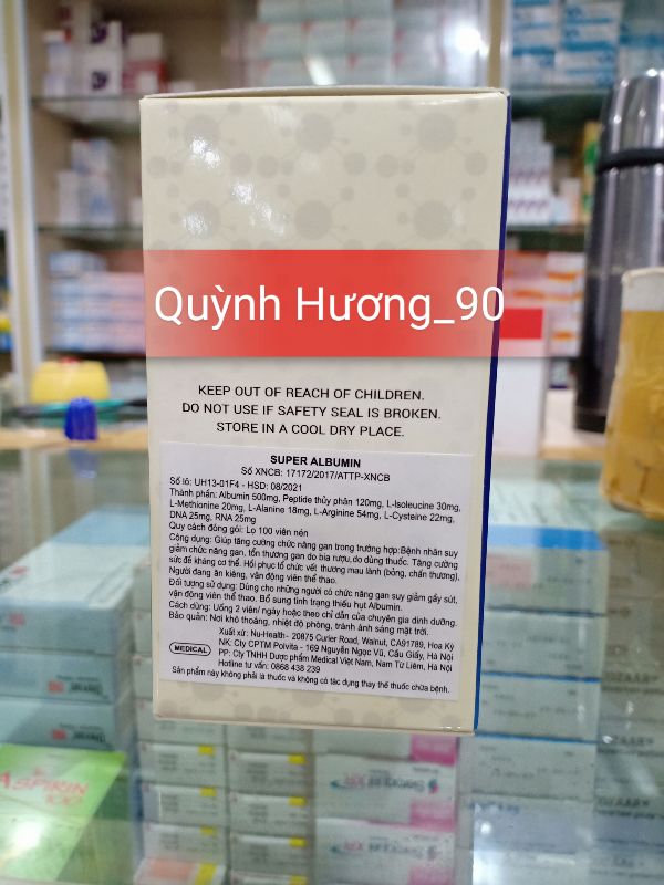 ➡️ Quỳnh Hương shop cam kết hàng chuẩn giá cả hợp lý.HOẠT CHẤT của Super AlbuminAlbuminTHÀNH PHẦN của Super AlbuminAlbumine: 500mg, Peptid thủy phân: 120mg, L-Isoleucine: 30mg, L-Methionine: 20mg, L-Alanine: 18mg, L-Arginine: 54mg, L-Cystine: 22mg, DNA: 25mg, RNA: 14mgCÔNG DỤNG của Super AlbuminGan là cơ quan nội tạng có vai trò quan trọng, chịu trách nhiệm sản xuất nhiều chất và giúp cơ thể thải độc, nếu gan bị mắc bệnh, chức năng không được đảm bảo, hơn nữa, gan là cơ quan có sự sống mãnh liệt nhất trong nội tạng, vì vậy chỉ khi bệnh trở nặng các biểu hiện của bệnh gan mới xuất hiện. Với những bệnh nhân xơ gan, viêm gan siêu vi, ung thư gan, .. khi chức năng gan quá yếu, không thể tổng hợp nên các chất cần thiết, việc bổ sung từ bên ngoài là điều cần thiết. vì vậy sự ra đời của sản phẩm Super Albumin giúp hỗ trợ điều trị các triệu chứng viêm gan vi rút, xơ gan, men gan cao, mẩn ngứa, tăng cường chức năng giải độc của gan, giúp bảo vệ tế bào gan luôn khỏe mạnh.CÁCH DÙNG - LIỀU DÙNG của Super AlbuminBảo vệ sức khỏe: Ngày 1 viên duy trì hàng ngày. Hoặc theo chỉ dẫn của bác sĩĐỐI TƯỢNG SỬ DỤNG của Super AlbuminDùng cho những người có chức năng gan suy giảm, gầy sút, vận động viên thể thao. Bổ sung tình trạng thiếu hụt Albumin.QUY CÁCH ĐÓNG GÓI của Super AlbuminHộp 100 viên.NHÀ SẢN XUẤT của Super AlbuminUSA