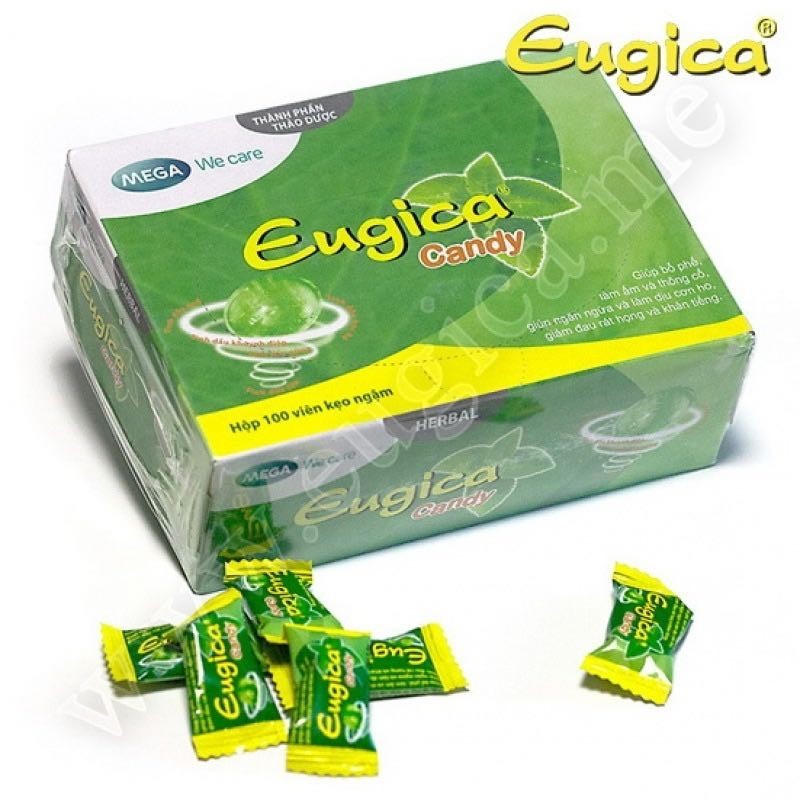 - Eugica Candy làm giảm các triệu chứng ho, đau họng và sát trùng đường hô hấp: Eugica Candy có tính sát khuẩn làm giảm các triệu chứng ho, viêm họng, đau họng, rát cổ, khản tiếng. Ngoài ra, Eugica Candy còn được sử dụng trong trường hợp ho do cảm lạnh, kết hợp trong quá trình điều trị viêm nhiễm đường hô hấp.
