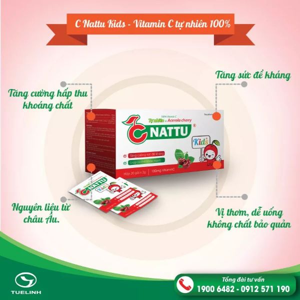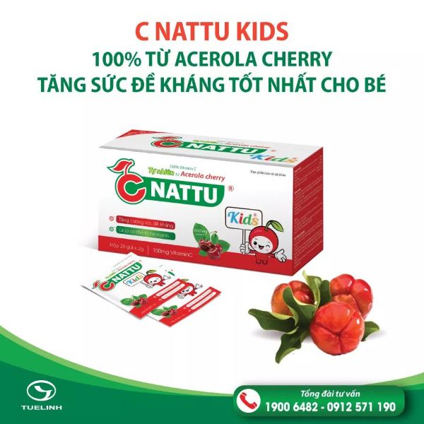 C Nattu Kids là sản phẩm tiên phong trên thị trường chiết xuất từ vitamin C tự nhiên trong Cherry – với hàm lượng C bậc nhất thế giới, có độ chua (pH) trung tính rất thân thiện với hệ tiêu hóa, giúp tăng cường hấp thu tối đa,tăng sức đề kháng cho trẻ. Ngoài ra, sản phẩm còn kết hợp với Rutin và Hesperidin giúp tăng sức bền thành mạch, ngăn chặn chảy máu cam, chảy máu chân răng, phòng ngừa xuất huyết dưới da. Với nguồn nguyên liệu nhập khẩu từ châu Âu, được sản xuất trên dây truyền hiện đại, C Nattu kids sẽ là chìa khóa vàng để bảo vệ sức khỏe cho bé yêu.CÔNG DỤNG- Giúp tăng cường sức đề kháng và khả năng phòng bệnh của trẻ trước các nguy cơ bệnh tật, giúp cơ thể khỏe mạnh và mau lành vết thương.- Bổ sung vitamin C nguồn gốc tự nhiên, cần thiết cho sự tạo thành và duy trì cấu trúc chắc khỏe của nướu, xương, sụn, da và mô liên kết.- Tăng sức bền thành mạch, ngăn ngừa xuất huyết.CÁCH DÙNG: Trẻ dưới 6 tuổi 1 gói 1 ngày Trẻ trên 6 tuổi 2 gói 1 ngàyCó thể ăn trực tiếp hoặc pha nước uống chữa bệnhSản phẩm không phải là thuốc ko có tác dụng thay thế thuốcĐóng gói 1 hộp 20 gói 2gSản phẩm của công ty dược phẩm Tuệ LinhZalo shop 0942004664