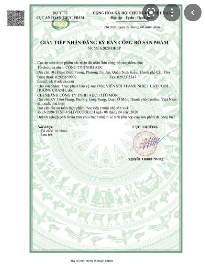 Thành phần: Chiết xuất Actiso.........................................50g Chiết xuất linh chi đỏ....................................0.08g Chất tạo ngọt: isomalt....................................vđ 4g Công dụng Bột tan thanh nhiệt Live Cool Nam Dược - Giúp thanh nhiệt giai đoc, mát gan, tăng cường sức đề kháng. - Hỗ trợ giảm các triệu chứng nhiệt miệng, nóng trong, mụn nhọt, mẩn ngứa do suy giảm chức năng gan và sức đề kháng kém. Đối tượng sử dụng Bột sủi thanh nhiệt Live Cool Nam Dược - Người bị nhiệt miệng, nóng trong, dị ứng, mề đay, chán ăn, mệt mỏi, da vàng, nước tiểu vàng do suy giảm chức năng gan. - Người hay sử dụng, tân dược kéo dài ảnh hưởng đến chức năng gan Hướng dẫn sử dụng : * Trẻ em từ 6-12 tuổi : ½ gói x 3-4 lần/ngày. * Người lớn và trẻ em từ 12 tuổi trở lên : 1 gói x 3-4 lần/ngày. Cắt 1 gói bột cho vào cốc sau đó thêm 150ml – 200ml nước đun sôi để nguội, ngon hơn khi uống lạnh. Không pha với nước nóng để tránh làm ảnh hưởng đến tác dụng của sản phẩm. Bảo quản: Nơi khô ráo, thoáng mát, tránh ánh nắng mặt trời Quy cách đóng gói: Tuýp 16 Viên