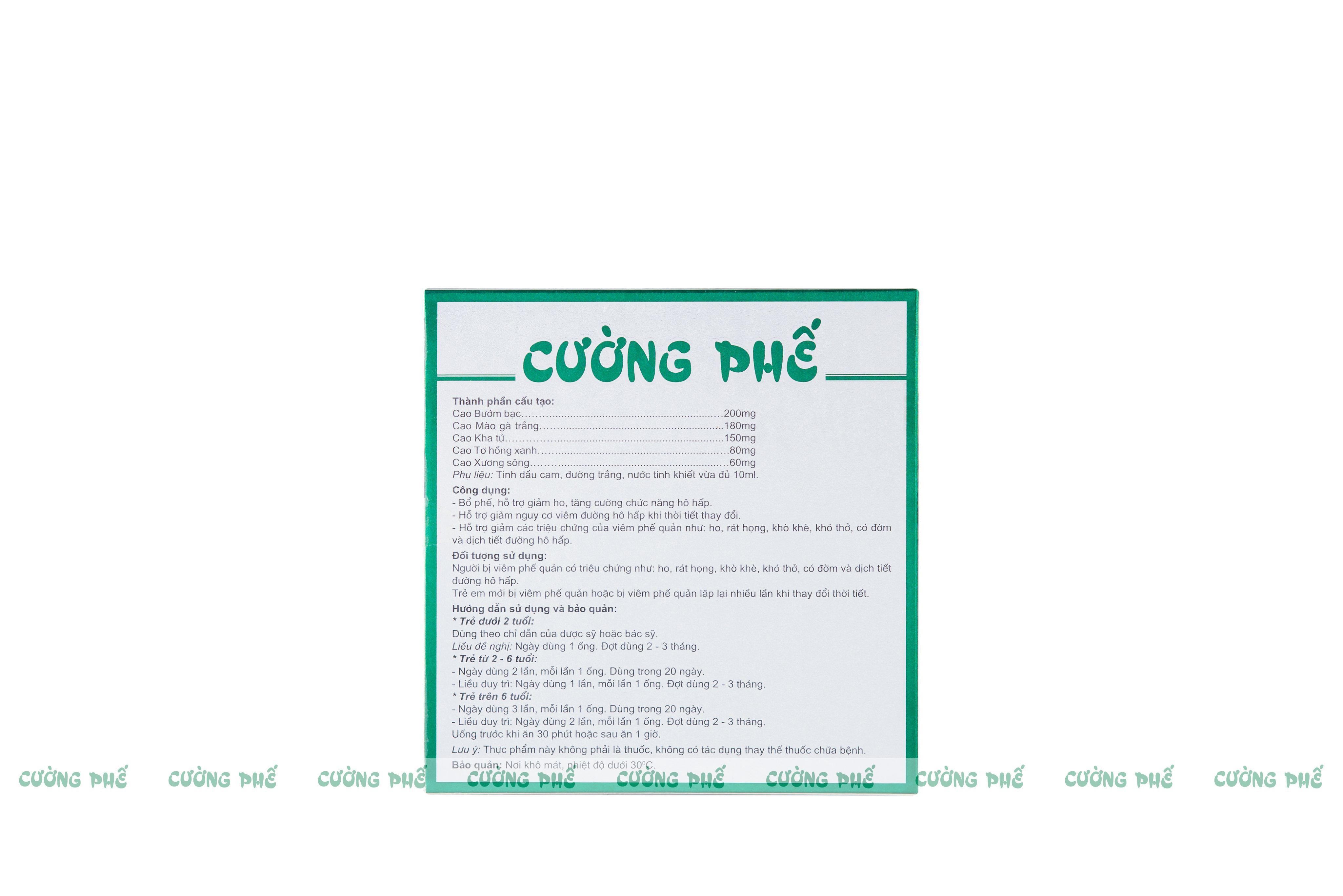 - Sản phẩm Cường Phế là sự kết hợp hoàn hảo của 5 loại dược liệu quý với hoạt chất nhóm Flavonoid: Cao Kha tử; Cao Bướm bạc; Cao Xương sông; Cao mào gà trắng; Cao tơ hồng xanh
