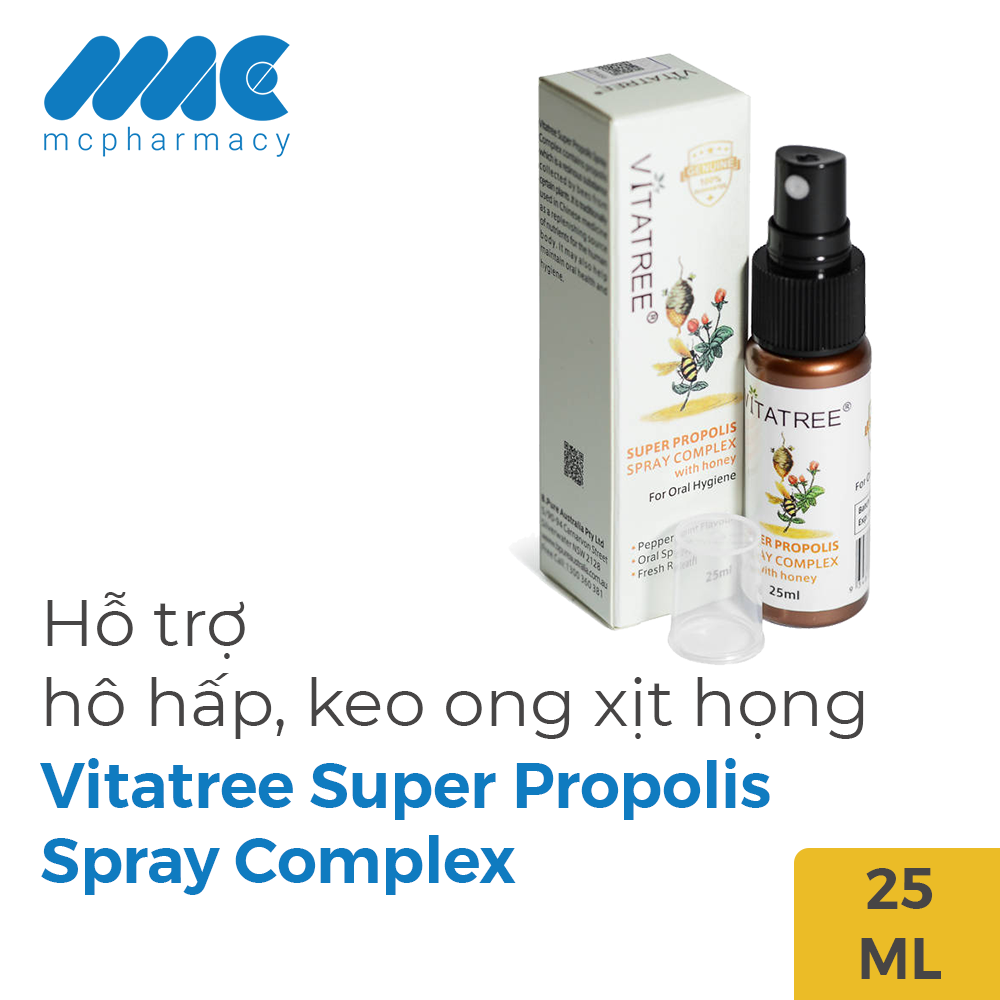 Keo ong xịt họng Vitatree Super Propolis Spray Complex chứa thành phần keo ong cô đặc, mật ong manuka bổ sung kháng thể tự nhiên của ong, tăng cường miễn dịch. Sản phẩm dùng cho người lớn và trẻ em trên 2 tuổi.