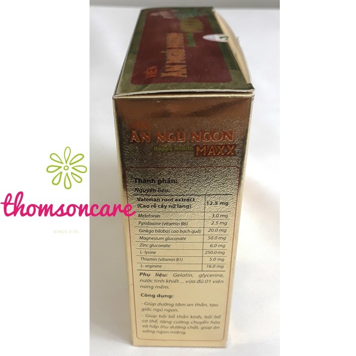 🎯🎯🎯🎯Thành phần Viên ăn ngủ ngon Happy Health Maxx:Valerian root extract (Cao rễ cây nữ lang)Melatonin Pyridoxine (vitamin B6)Ginkgo biloba( cao bạch quả)Magnesium gluconateZinc gluconateL- lysineThiamin (vitamin B1)L- argininePhụ liệu: Gelatin, Glycerine, nước tinh khiết vừa đủ 01 viên nang mềm 1200mg