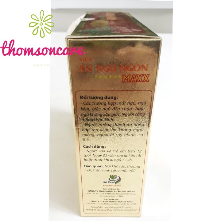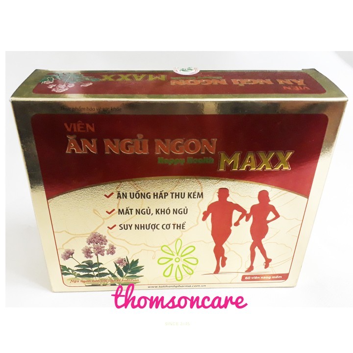 💪💪 Công dụng Viên ăn ngủ ngon Happy Health Maxx: Giúp dưỡng tâm an thần, tạo giấc ngủ ngon.Giúp bồi bổ thần kinh, bồi bổ cơ thể, tăng cường chuyển hóa và hấp thu dưỡng chất, giúp ăn uống ngon miệng.👶Đối tượng:Các trường hợp mất ngủ, ngủ kém, giấc ngủ đến chậm hoặc ngủ không sâu giấc, căng thẳng thần kinh.Người trưởng thành ăn uống hấp thu kém, ăn không ngon miệng, người bị suy nhược cơ thể.☘️☘️Cách dùng:Người lớn và trẻ em trên 12 tuổi: ngày 02 viên sau khi ăn tối hoặc trước khi đi ngủ 1-2h.
