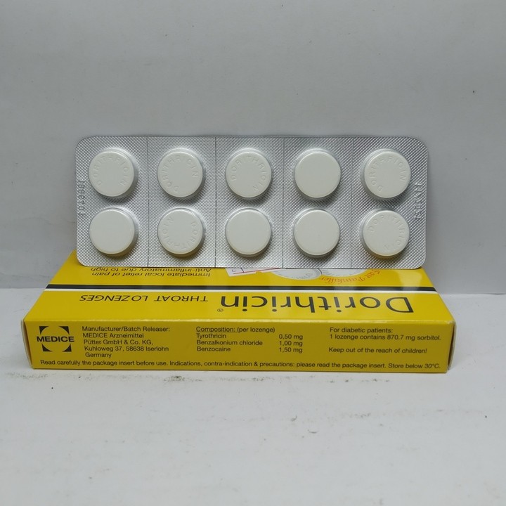CÔNG DỤNG – CHỈ ĐỊNHTyrothricin là một loại kháng sinh có tác dụng tại chỗ.Benzalkonium là chất sát khuẩn phổ biến, có phổ kháng khuẩn rộng, bao gồm cả vi khuẩn Gram dương và vi khuẩn Gram âm.Benzocain giúp làm dịu niêm mạc miệng, họng nhanh chóng và hiệu quả giúp người bệnh có cảm giác dễ chịu khi ngậm Dorithricin.Thuốc ngậm Dorithricin điều trị viêm miệng, viêm họng, cảm giác đau nhức họng khi nuốt, viêm hầu họng, viêm thanh quản, viêm lợi, niêm mạc miệng