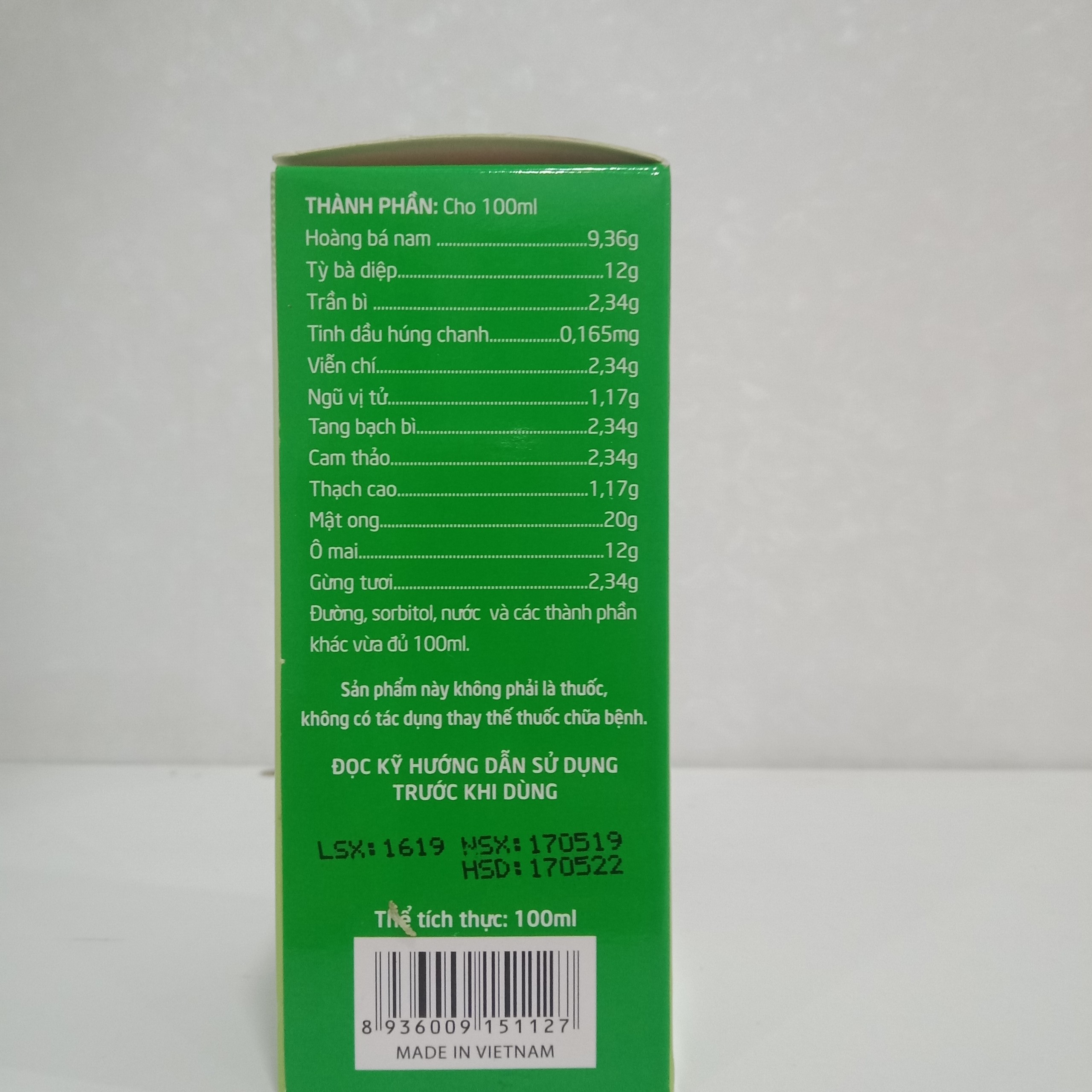 Thành phần: Cho 100mlHoàng bá nam………………………………………. 9,36gTỳ bà diệp……………………………………………. 12gTrần bì………………………………………………… 2,34gTinh dần húng chanh………………………………. 0,165gViễn chí………………………………………………. 2,34gNgũ vị tử…………………………………………….. 1,17gTang bạch thì……………………………………….. 2,34gCam thảo……………………………………………. 2,34gThạch cao…………………………………………… 1,17gMật ong……………………………………………… 20gÔ mai………………………………………………… 12gGừng tươi……………………………………………. 2,34gĐường, sorbitol, nước và các thành phần khác vừa đủ 100ml