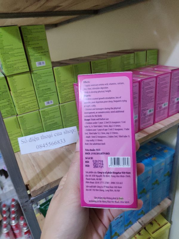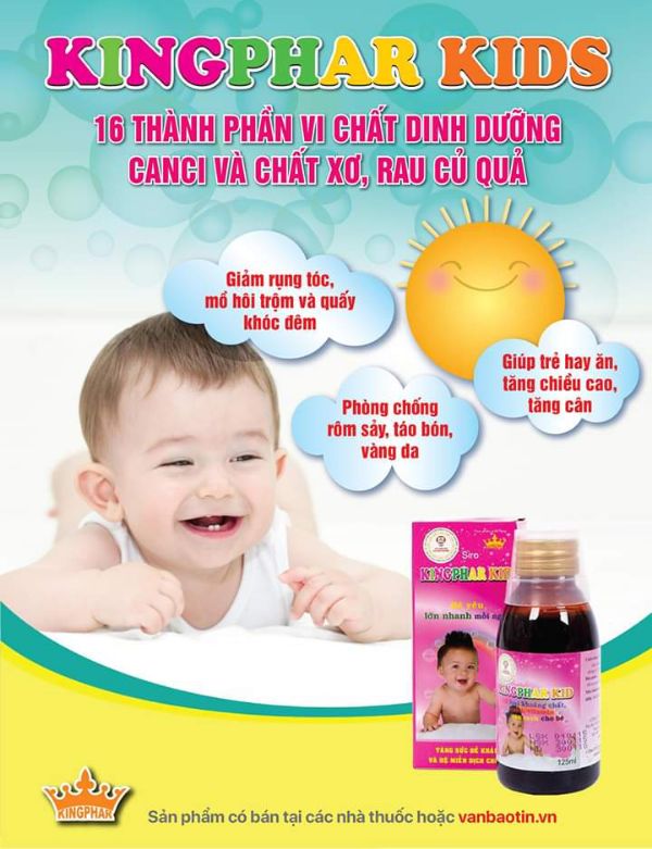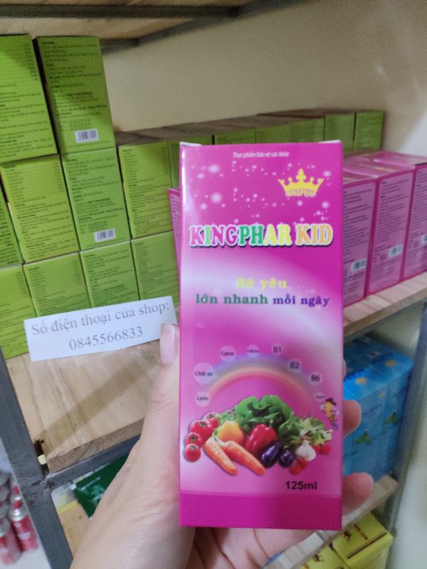 Để giảm bớt sự lo lắng và giải phóng gánh nặng cho mẹ của bé. Nhóm các nhà khoa học của công ty KINGPHAR đã nghiên cứu và ứng dụng công nghệ tiên tiến của thế giới để phát triển thành công sản phẩm KINGPHAR KID cho bé yêu của bạn. Đây là sản phẩm có sự kết hợp hoàn hảo 16 thành phần được bào chế dưới dạng SIROgồm các loại thảo dược, vitamin tự nhiên, khoáng chất, acid amin, chất xơ và rau sạch chiết xuất cần thiết cho trẻ. KINGPHAR KID giúp trẻ ăn ngon, ngủ tốt, phát triển trí não, chiều cao, tăng cường thể chất, tăng sức đề kháng và khả năng miễn dịch.KINGPHAR KID tốt cho trẻ biếng ăn, chậm phát triển, hay bị ốm vặt, tiêu chảy, nôn trớ, quấy khóc về đêm… Sản phẩm không những dùng được cho trẻ nhỏ mà dùng cho cả thanh thiếu niên đang phát triển cơ thể, thời kỳ dưỡng bệnh và giai đoạn ăn kiêng. KINGPHAR KID là một giải pháp giúp phòng thiếu vi chất dinh dưỡng và chữa tận gốc chứng biếngở trẻ.✳️ THÀNH PHẦN TRONG 125 ml siro KINGPHAR KID– Lysine: kích thích trẻ ăn ngon, trợ giúp tạo xương, thúc đẩy sự tăng trưởng và phát triển chiều cao.– Taurin: giúp hoàn thiện não bộ và võng mạc, phát triển trí tuệ.– Calcium: rất quan trọng cho trẻ trong giai đoạn phát triển thể chất đặc biệt là xương và răng.– Echinacea (thảo dược của người da đỏ, Bắc Mỹ) giúp tăng cường hệ miễn dịch, nâng cao sức đề kháng chống lại các bệnh về đường hô hấp trên, phòng và chống cảm cúm, viêm phế quản.– Bacopa: thảo dược được chính thức ghi vào dược điển Mỹ năm 2011 có tác dụng bổ thần kinh, bổ não, làm tăng trí nhớ và các chức phận của não bộ, tăng cường chỉ số IQ.– Cỏ sữa lá lớn: phòng và hỗ trợ điều trị các bệnh về đường ruột, ho hen, loét giác mạc.– Rau má: giải nhiệt, giải độc, giải độc gan, bổ não, thông tiểu dùng chữa thổ huyết, tả lỵ.– Đậu bắp: rất giàu vitamin A, vitamin B, C, chất sắt, kali, calci. Chất nhầy trong đậu bắp giúp bảo vệ niêm mạc đường tiêu hóa, giảm đau, giảm viêm. Đậu bắp nhiều chất xơ và chất nhầy nên còn có tác dụng nhuận tràng.– Xúp lơ xanh: có khả năng ngăn chặn sự phát triển của các tế bào gây ung thư da.– Rau chân vịt: rất bổ dưỡng và đặc biệt tốt cho trẻ bị vàng da, viêm gan, gầy xanh xao do thiếu máu.– Cà rốt: Hút chất nhầy, độc tố, cung cấp beta caroten tiền vitamin A.– Đậu ve: trợ giúp tuần hoàn ngoại biên, tăng khả năng tập trung và cải thiện trí nhớ, hỗ trợ phân phối và đồng hóa chất béo trong hệ tiêu hóa.– Bông cải xanh: có chứa một loạt các dẫn xuất indol, có thể cải thiện hoạt động của gan, tăng khả năng phá vỡ các chất gây ung thư. Bông cải xanh chiết xuất có thể ngăn ngừa ung thư da.– Ngoài ra KINGPHAR KID còn bổ xung thêm các loại Vitamin B1, B2 và B6 cho nhu cầu thiết yếu của trẻ.✳️ CÔNG DỤNG:Bổ sung acid amin, vitamin, Canci, chất xơ, chất rau cần thiết cho cơ thể, giúp trẻ em ăn ngon, ngủ tốt, giúp phát triển trí não, chiều cao, tăng cường thể chất, sức đề kháng, khả năng miễn dịch.✳️ ĐỐI TƯỢNG SỬ DỤNG:– Dùng cho trẻ em nhất là trẻ em trong giai đoạn phát triển cơ thể.– Trẻ em biếng ăn, rối loạn chuyển hoá, còi xương, thời kỳ dưỡng bệnh, sau ốm, ăn kiêng.· Trẻ em cần tăng cường thể chất, sức đề kháng, khả năng miễn dịch.✳️ CÁCH DÙNG - LIỀU DÙNG: Lắc đều trước khi uống– Trẻ em 1 tuổi: 2,5ml (1/2 thìa cà phê)/ lần, ngày uống 2 lần. Uống vào buổi sáng và trưa sau bữa ăn.– Trẻ em 1-3 tuổi: 5ml (1 thìa cà phê)/ lần, ngày uống 2 lần. Uống vào buổi sáng và trưa sau bữa ăn.– Trẻ em trên 3 tuổi: 10ml (2 thìa cà phê)/ lần, ngày uống 2 lần. Uống vào buổi sáng và trưa sau bữa ăn.Mỗi đợt dùng 1-2 tháng